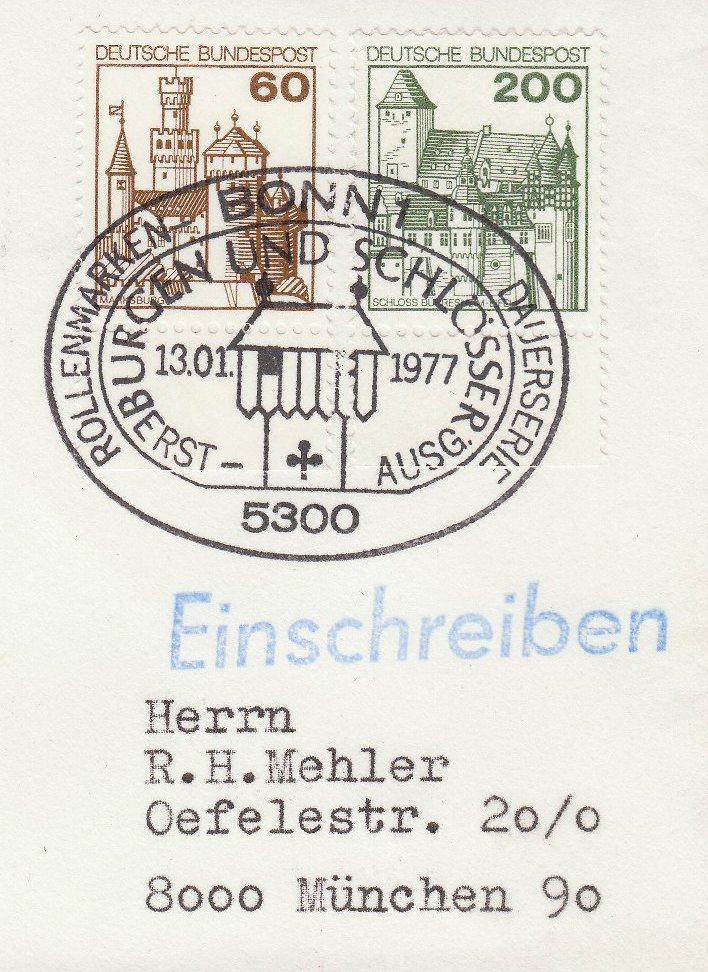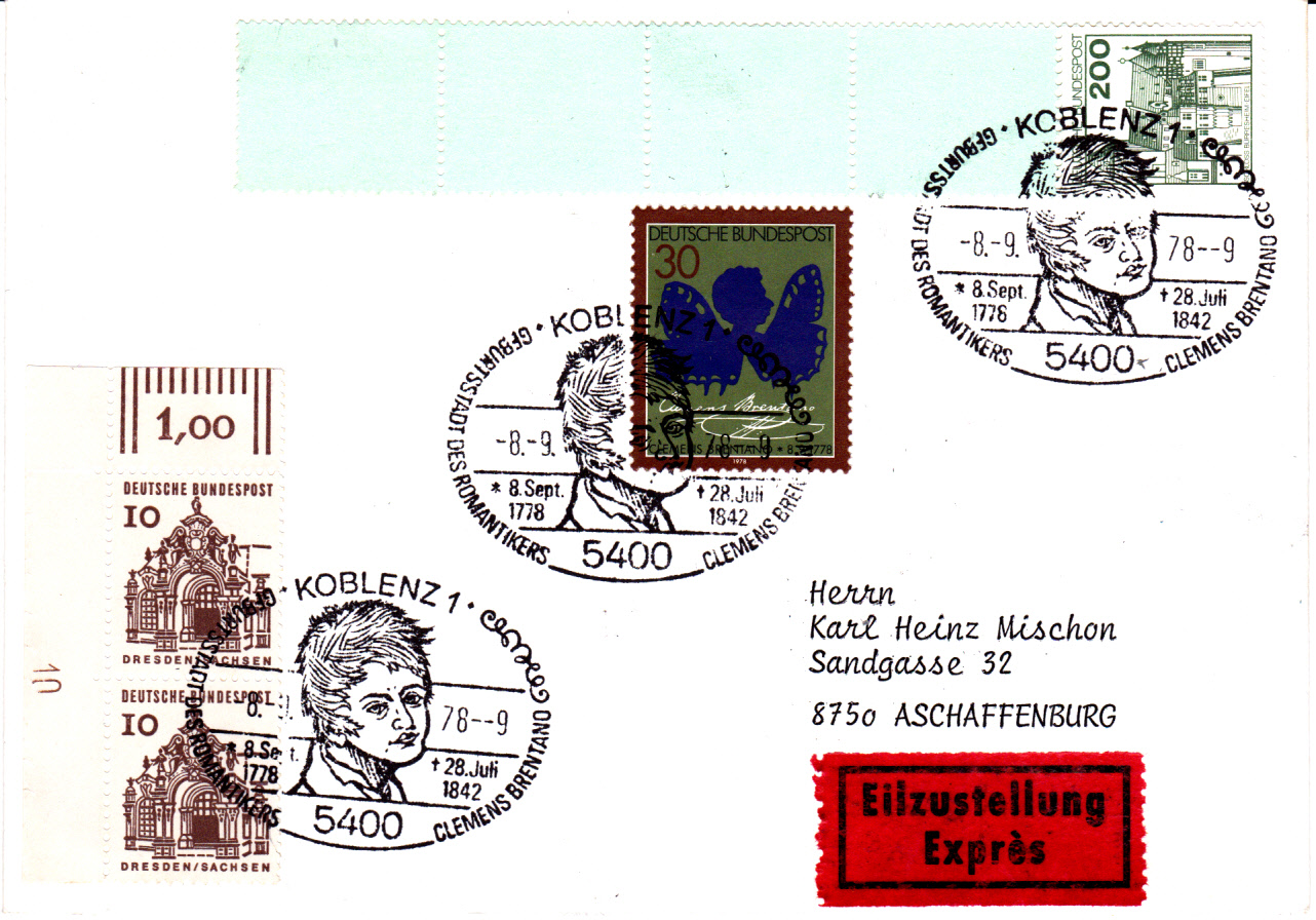 Eilbotenbrief von Koblenz nach Aschaffenburg frankiert unter anderem mit einem Rollenendstreifen mit vier anhängenden Leerfelder des 200 Pfennigwertes der DS Burgen und Schlösser (MiNr 920). Rückseitiger Ankunftsstempel Aschaffenburg 8.9.1978 18 Uhr.