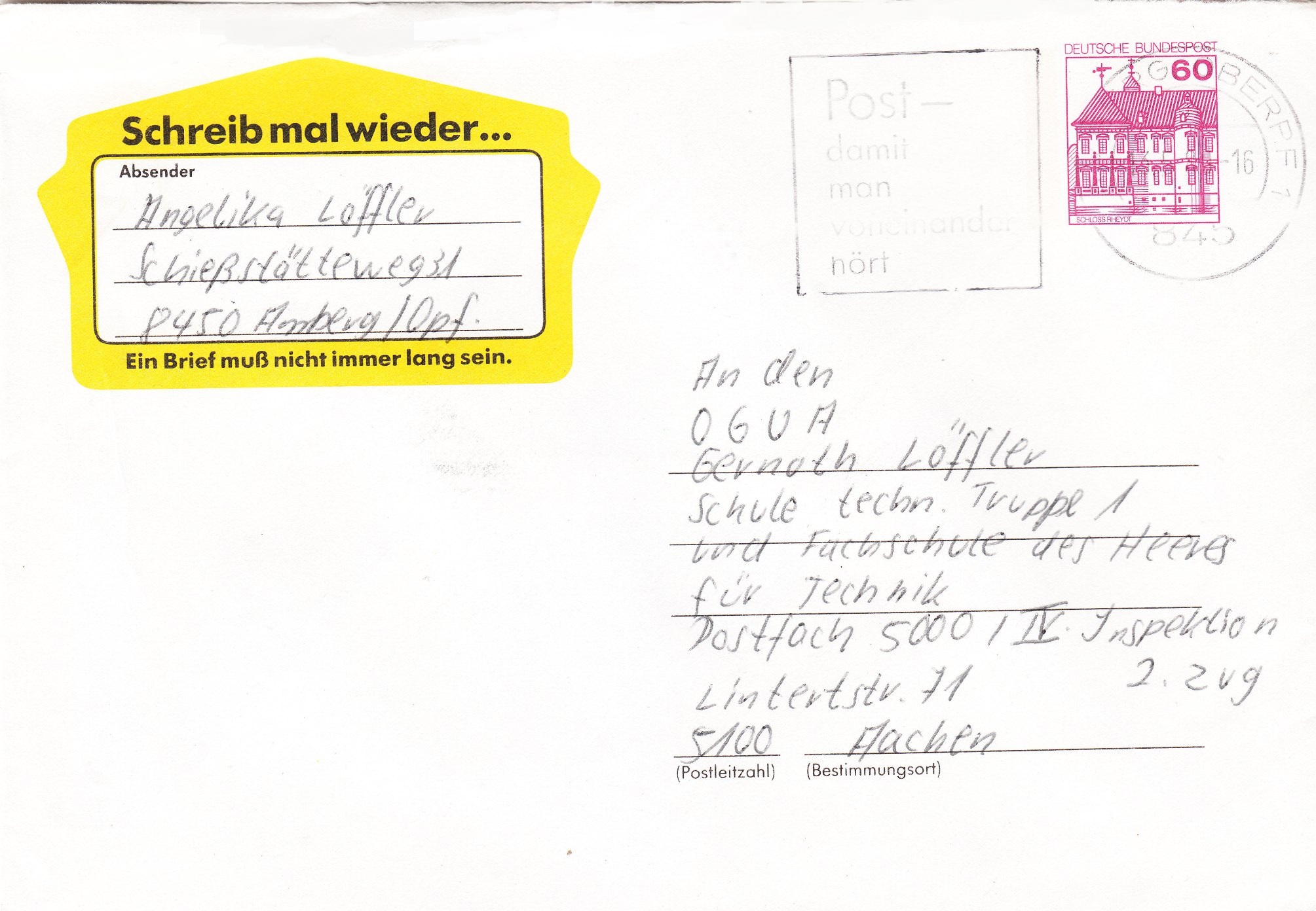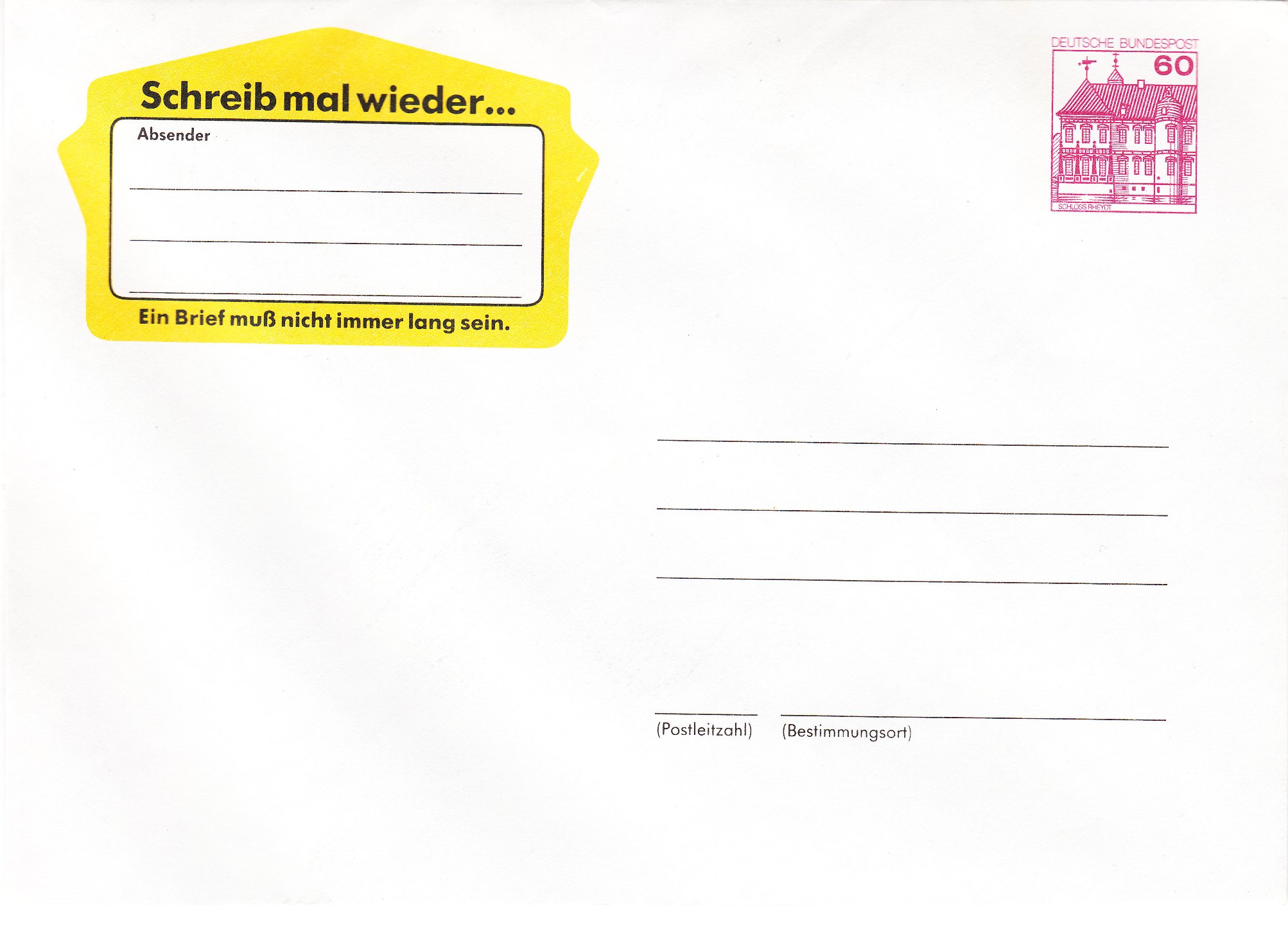 Im April 1980 führte die Deutsche Bundespost eine groß angelegte Werbeaktion mit dem Motto "Schreib mal wieder" durch. In zahlreiche Zeitschriften wurden Briefumschläge als Ganzsache mit eingedrucktem 60 Pf Wert der Dauerserie B&S eingeklebt, um so für das Briefeschreiben zu werben.