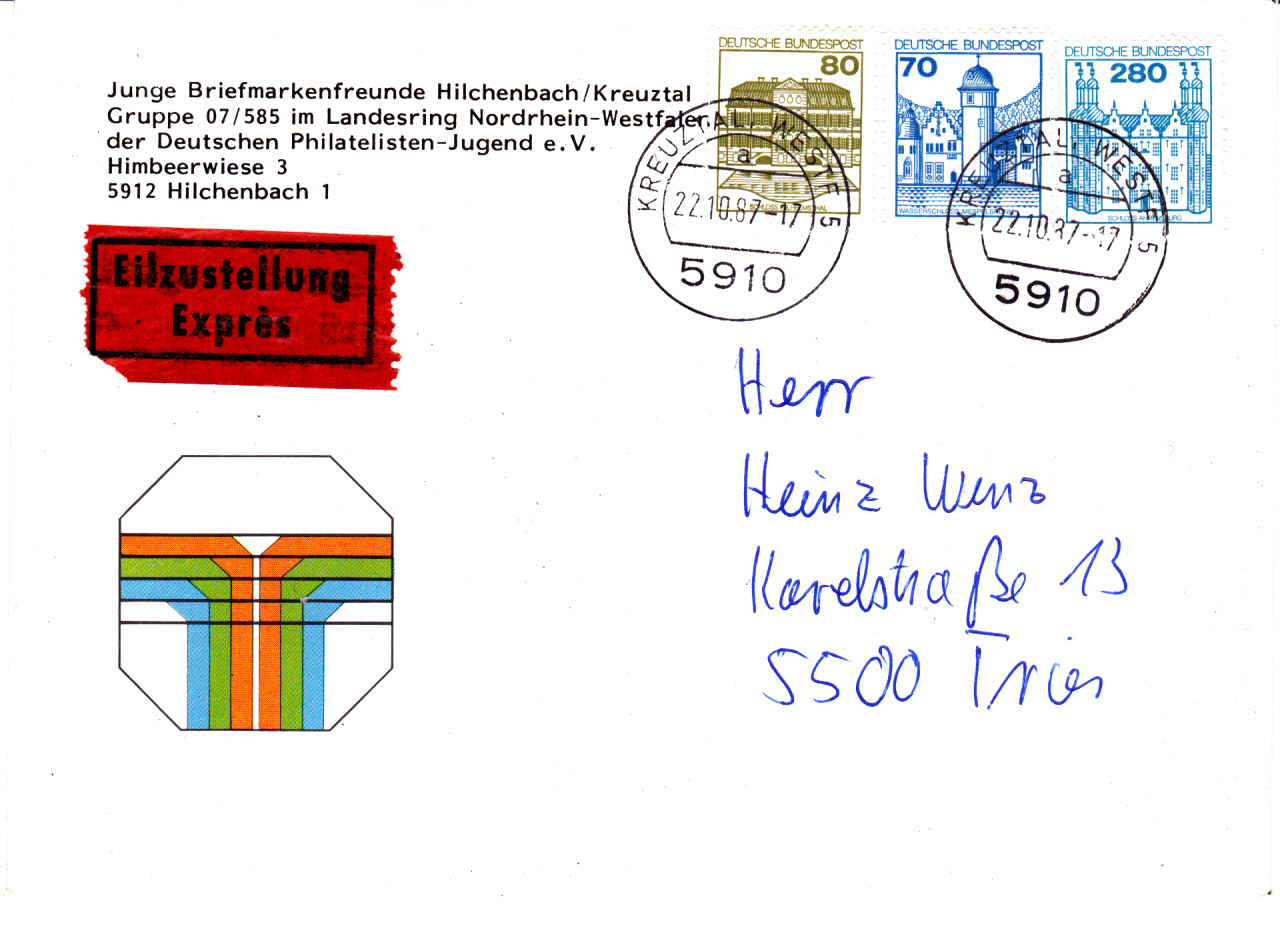 Mischfrankatur bestehend aus den Werten zu 70 Pf (MiNr 918), 80 Pf (MiNr 1140 A) und 280 Pf (MiNr 1142), insgesamt also 430 Pf. Das ist portogerecht für einen Standardbrief (80 Pf) mit Eilzustellung von 6 - 22 Uhr (350 Pf). Der Brief wurde am 22.10.1987 um 17 Uhr in Kreuztal aufgegeben. Rückseitig ist ein Durchgangsstempel vom gleichen Tag (22. um 20 Uhr) angebracht. Ein Ankunftsstempel wurde in Trier nicht abgeschlagen.