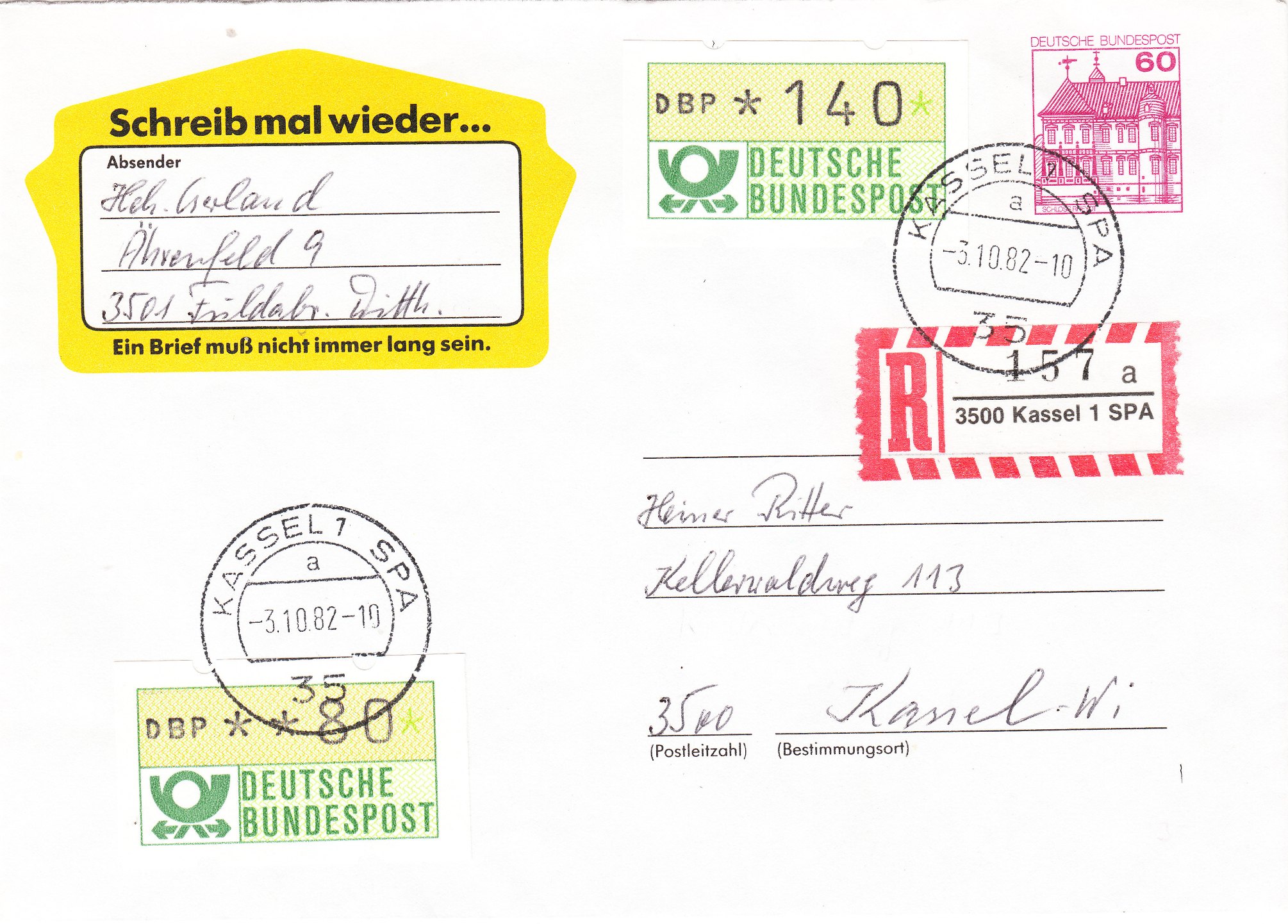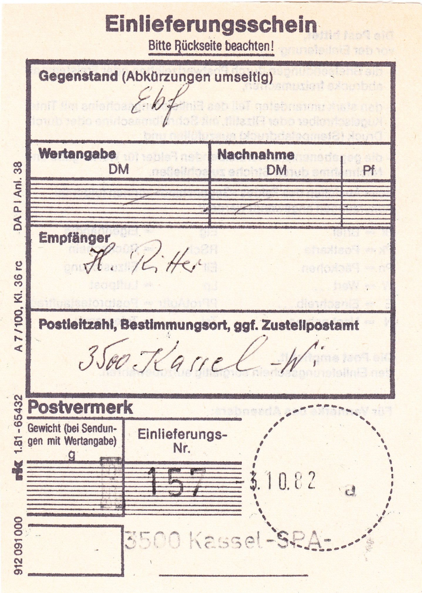 Dieser Beleg stammt von einem solchen Sonderpostamt in Kassel am 03.10.1982 als Letzttag der 22. Kasseler Herbstausstellung, leicht zu erkennen am "SPA" im Tagesstempel: