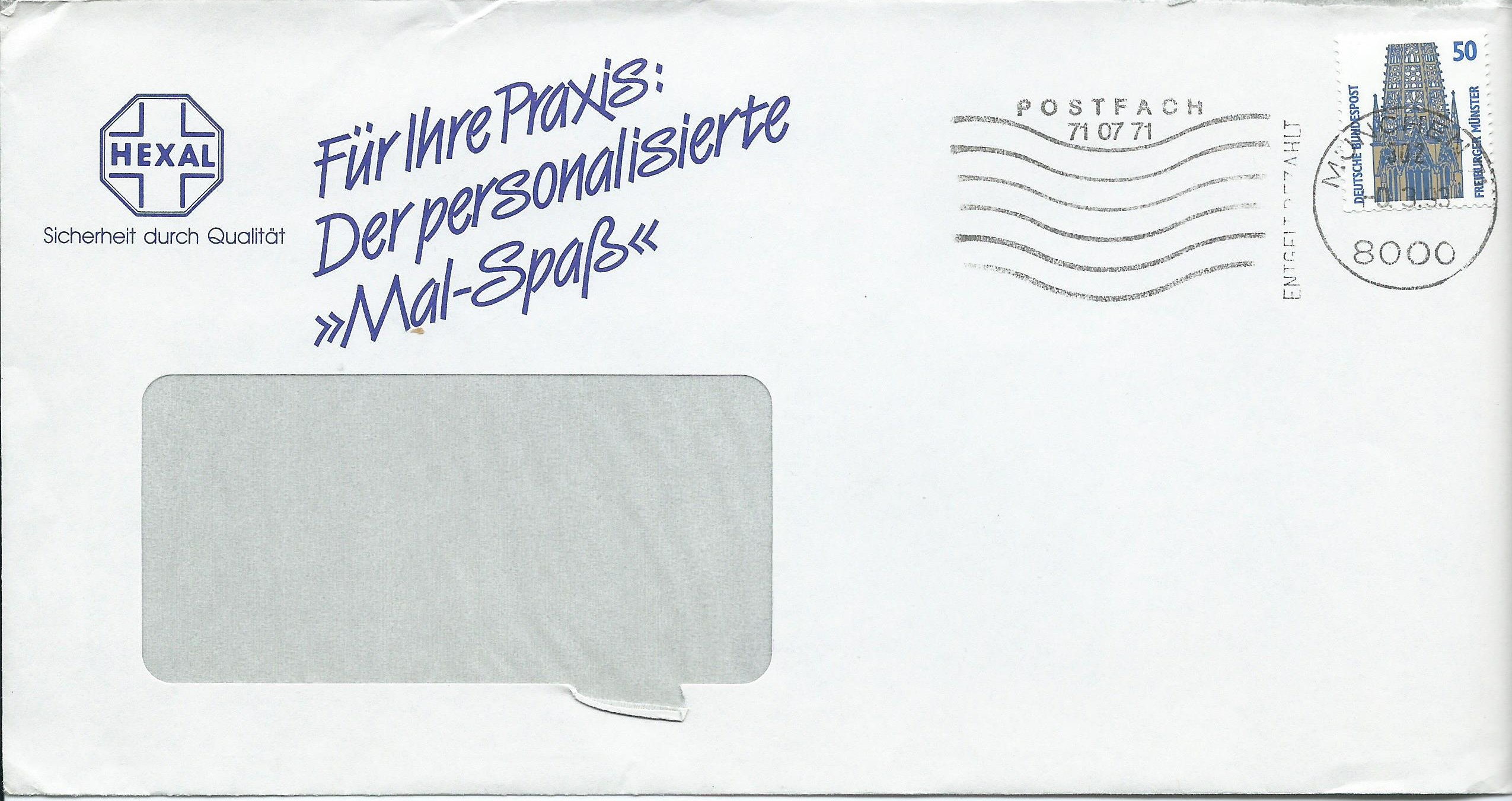 Und da kommt auch gleich meine Frage ins Spiel: Sind die (gerade die hier noch kommenden krummen Portostufen) überhaupt Portorichtig? Zum Beispiel die 40, 45, 50 und 60 Pf-Frankaturen kennt man ja eigentlich nur von den kleinen Umschlägen und hier sind sie auch auf den grossen „Tapeten“. Mein momentan einziges greifbares Nachschlagewerk „Michel-Spezial“ gibt da nicht so richtig etwas her. Ich ärgere mich schon wieder richtig, dass ich mein Michel- Handbuch Postgebühren verliehen habe, immer wenn man mal was braucht, ist es nicht da…