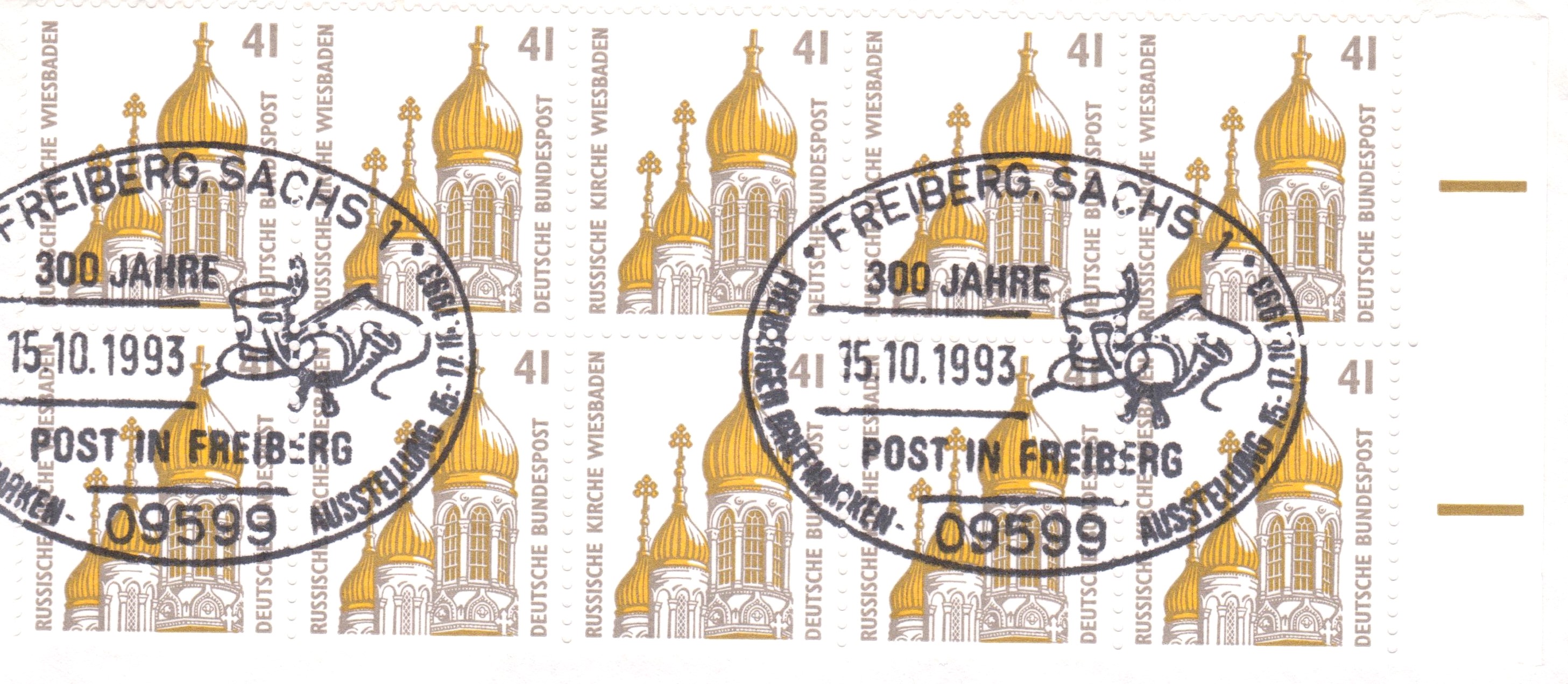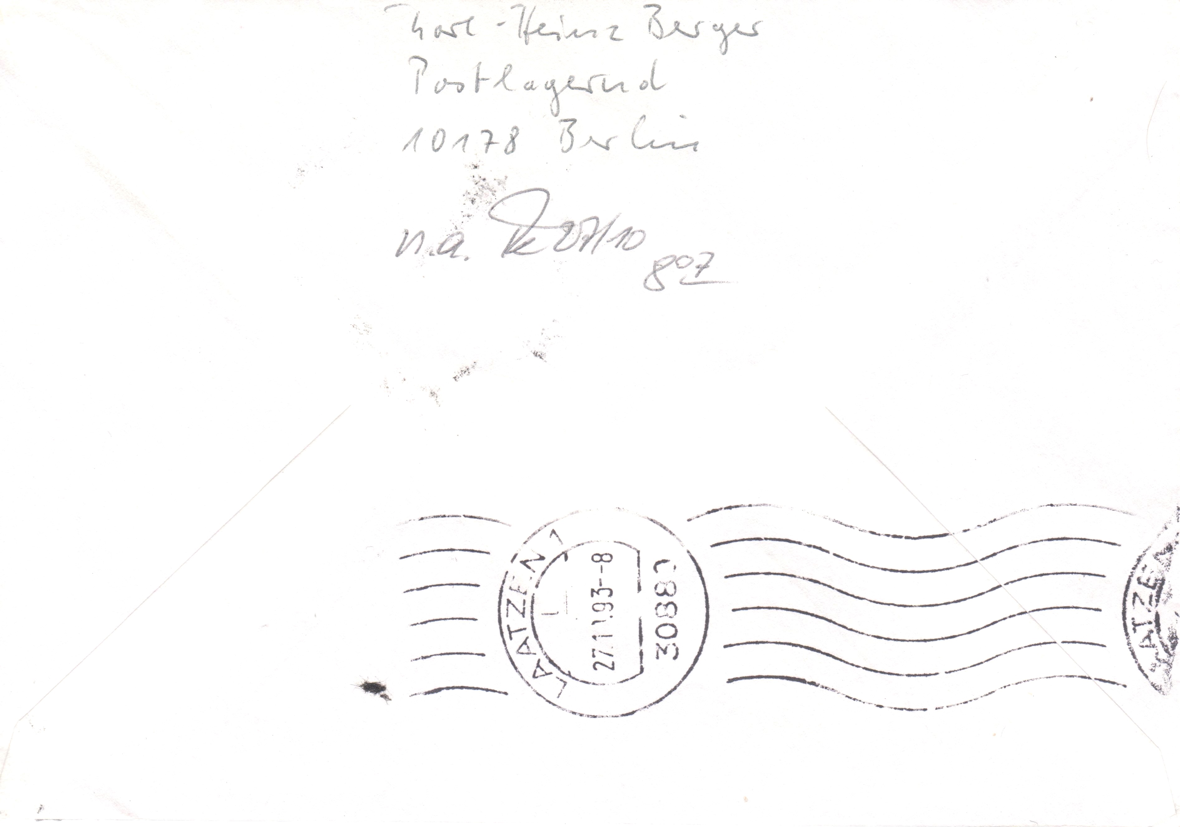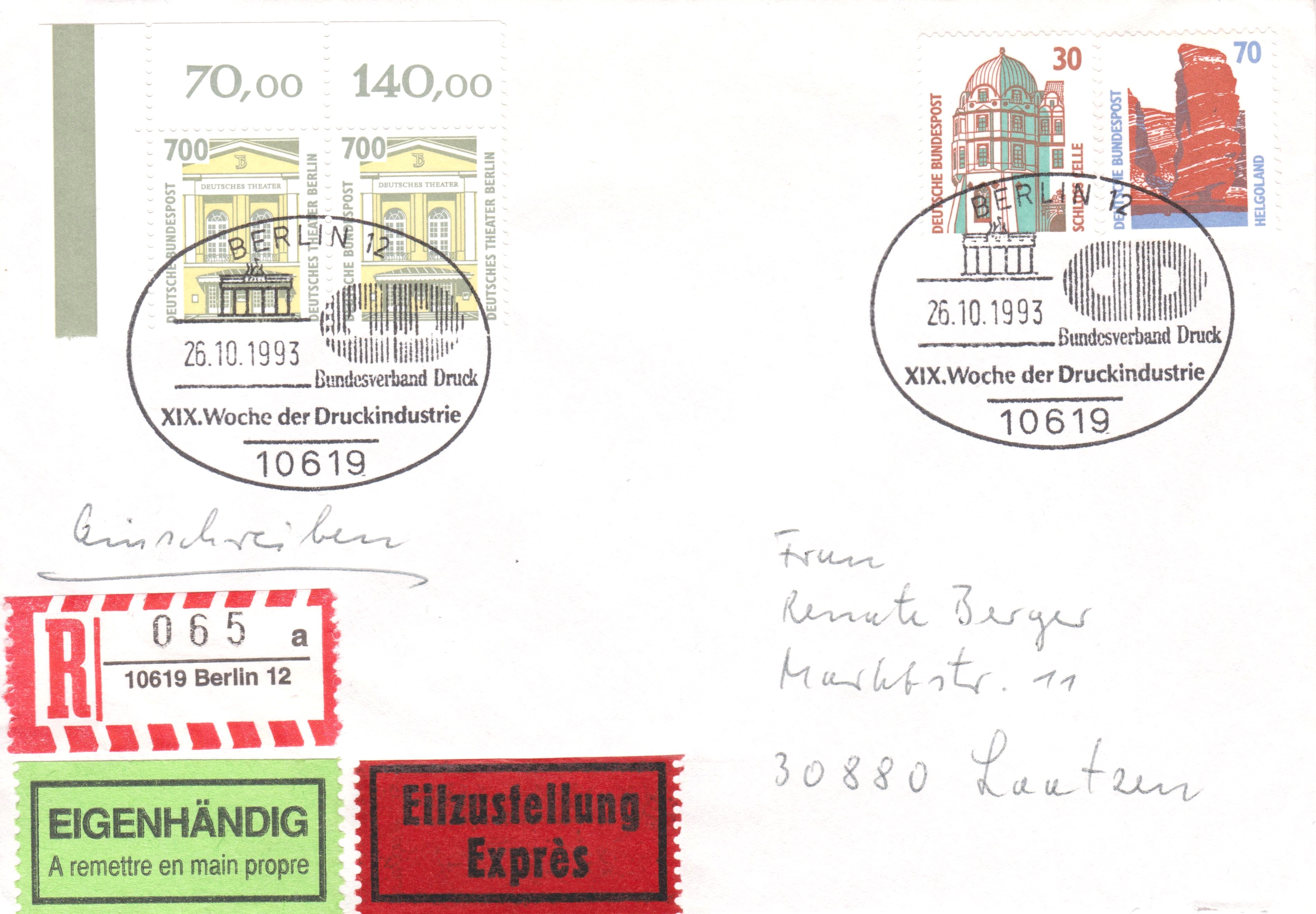 Dieser Brief vom 22.1.1998 von Bonn nach Würzburg wurde als Übergabe-Einschreiben verschickt und mit einem Stempel Bonn Bundeshaus entwertet. Das Porto betrug 110Pf für einen Brief bis 20g und 400Pf für die Sonderleistung Übergabe-Einschreiben, zusammen als 510Pf. Für die Frankatur wurde ein waagerechter Fünferstreifen zu je 100Pf aus der Dauerserie "Sehenswürdigkeiten" (MiNr 1934) und ein senkrechtes Paar zu 5Pf (MiNr 1448) verwendet.