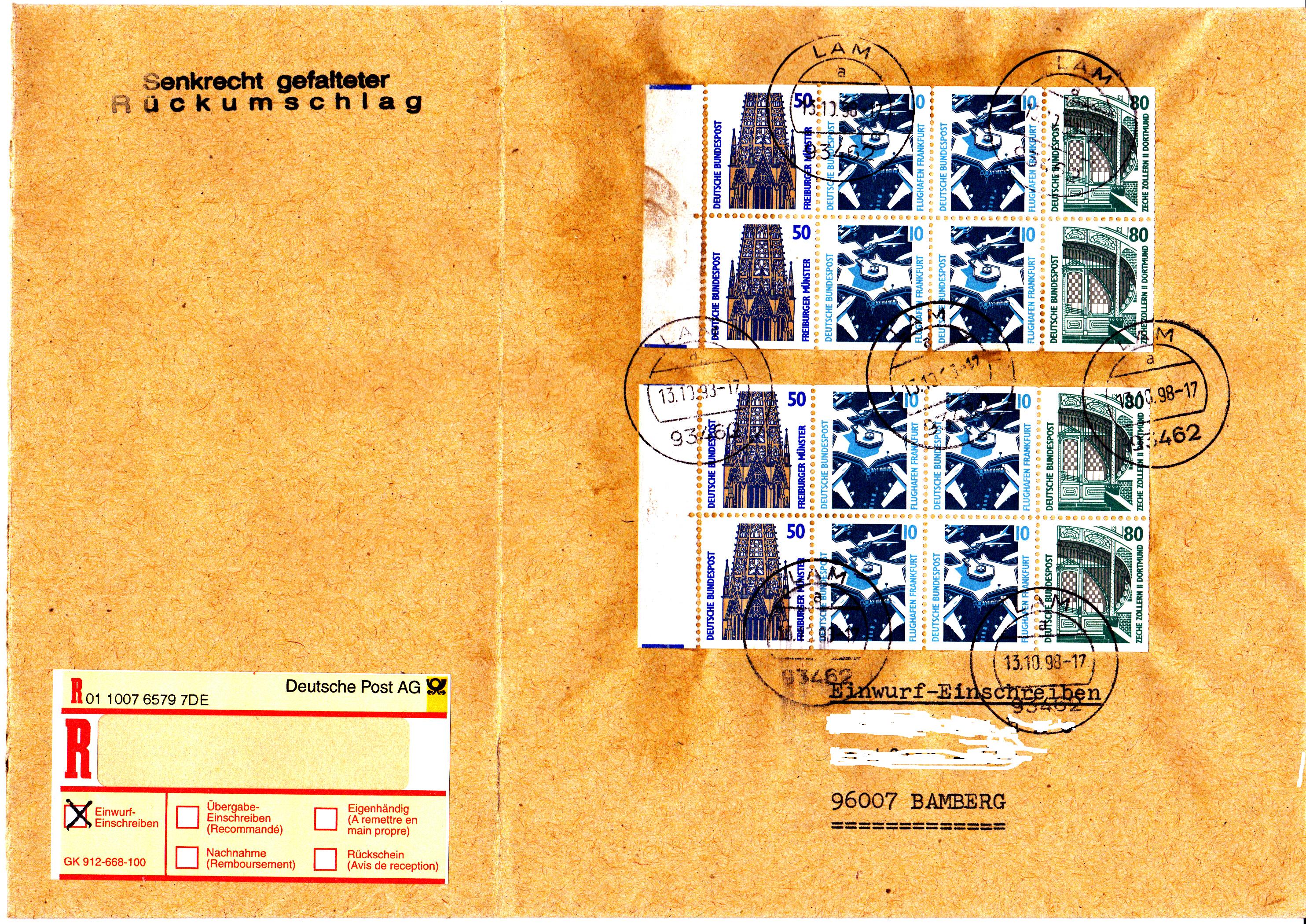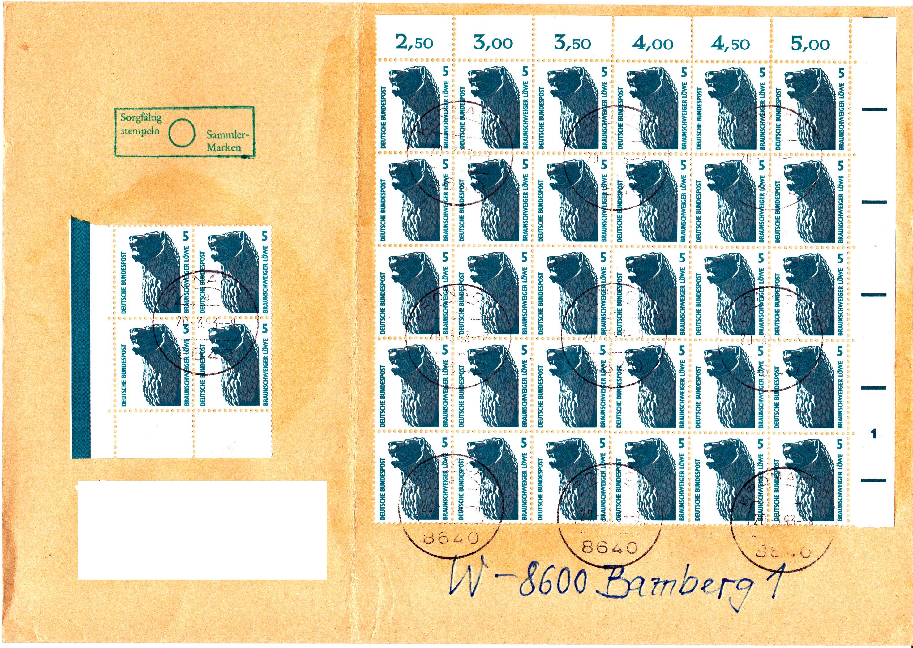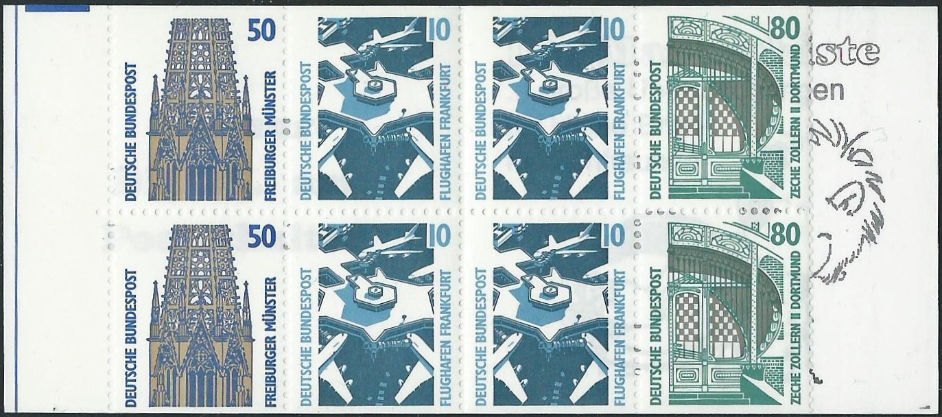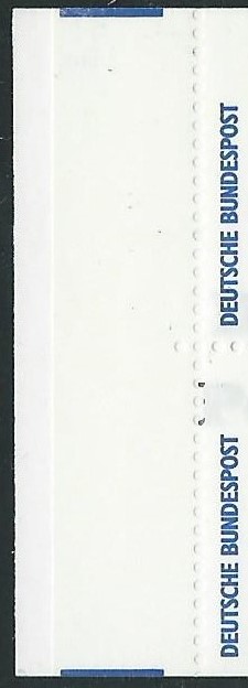 Nun habe ich in der letzten Rundsendung der ARGE RSV (...auf Deutsch erklärt: Eine Auswahlsendung an Marken und Sammelstücken aus der Arbeitsgemeinschaft, die an die Mitglieder verschickt wird und man sich gegen Bezahlung die Marken entnehmen darf, die einem gefallen. Das durchgearbeitete Paket schickt man dann an den nächsten Teilnehmer weiter.) ein Heftchen 29 b gefunden, wo der linke Rand noch einen senkrechten blauen Streifen aufweist. Auf dem vor meinem Beitrag gezeigten Bild von Heinz mit den Bogenmarken der 5 Pf kann man sehen, dass da der "dicke" senkrechte Farbbalken gedruckt wurde. Diese Heftchenbogen sind seinerzeit im sogenannten Kehrdruck hergestellt worden. (Wobei Heftchenbogen nicht so ganz stimmt, es sind keine einzelnen Bogen hergestellt worden, sondern Rollen.) Also in der Waagerechten gesehen Rand, 4 Marken richtig herum, anschliessend 4 Marken kopfstehend und wieder Rand, so dass 2 Heftchenblätter daraus gewonnen werden konnten. An den Rändern ist auch jeweils ein ähnlicher Farbbalken gedruckt worden, wie wir ihn von den Bogenmarken her kennen. Wenn nun der Kleberand des Heftchenblattes etwas zu breit geschnitten wurde, dann blieb ein Rest der senkrechten Farbstreifen sichtbar. Und dieser "Verschnitt" ist absolut selten! Mir selber ist nur eine Meldung aus der damaligen Ausgabezeit bekannt, wo ein Sammler ein solches Heftchen gefunden hat. Fragt mich bitte nicht, wo genau die Meldung erschien (Fachzeitung oder ARGE-Rundbrief), aber seit dem habe ich nie wieder davon gelesen oder gehört. Und nun lag ein Heftchen in der Auswahlsendung im Original, da habe ich zuschlagen müssen. Es war nicht billig, aber ob man ein solches Stück noch mal angeboten bekommt, wer weiss...