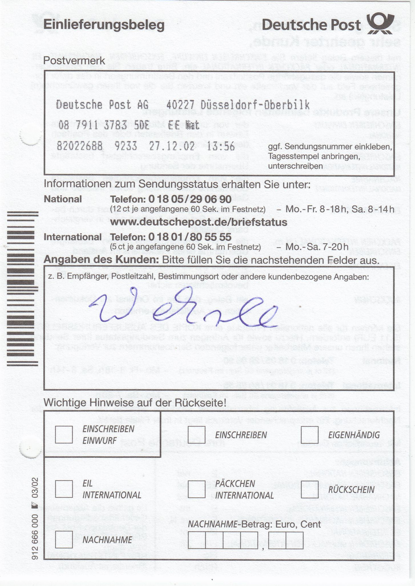 Der Einlieferungsbeleg ist ebenfalls erhalten: