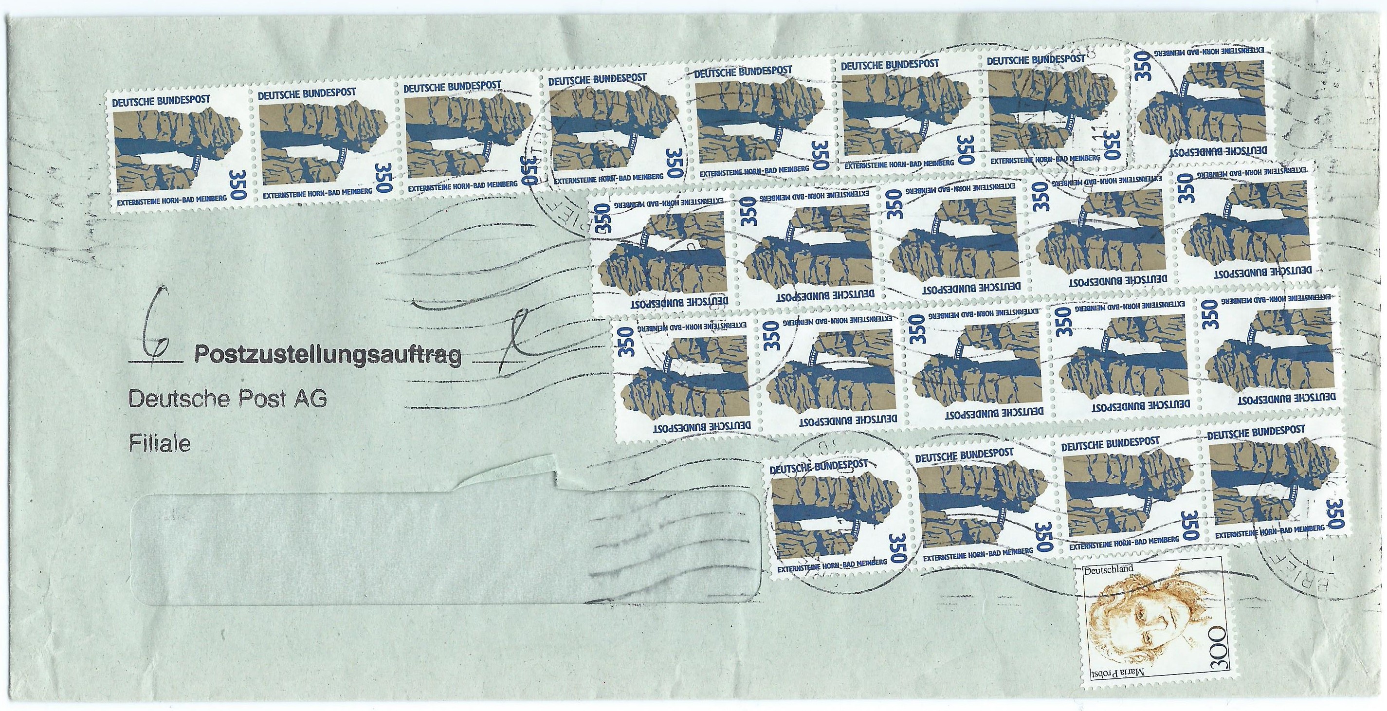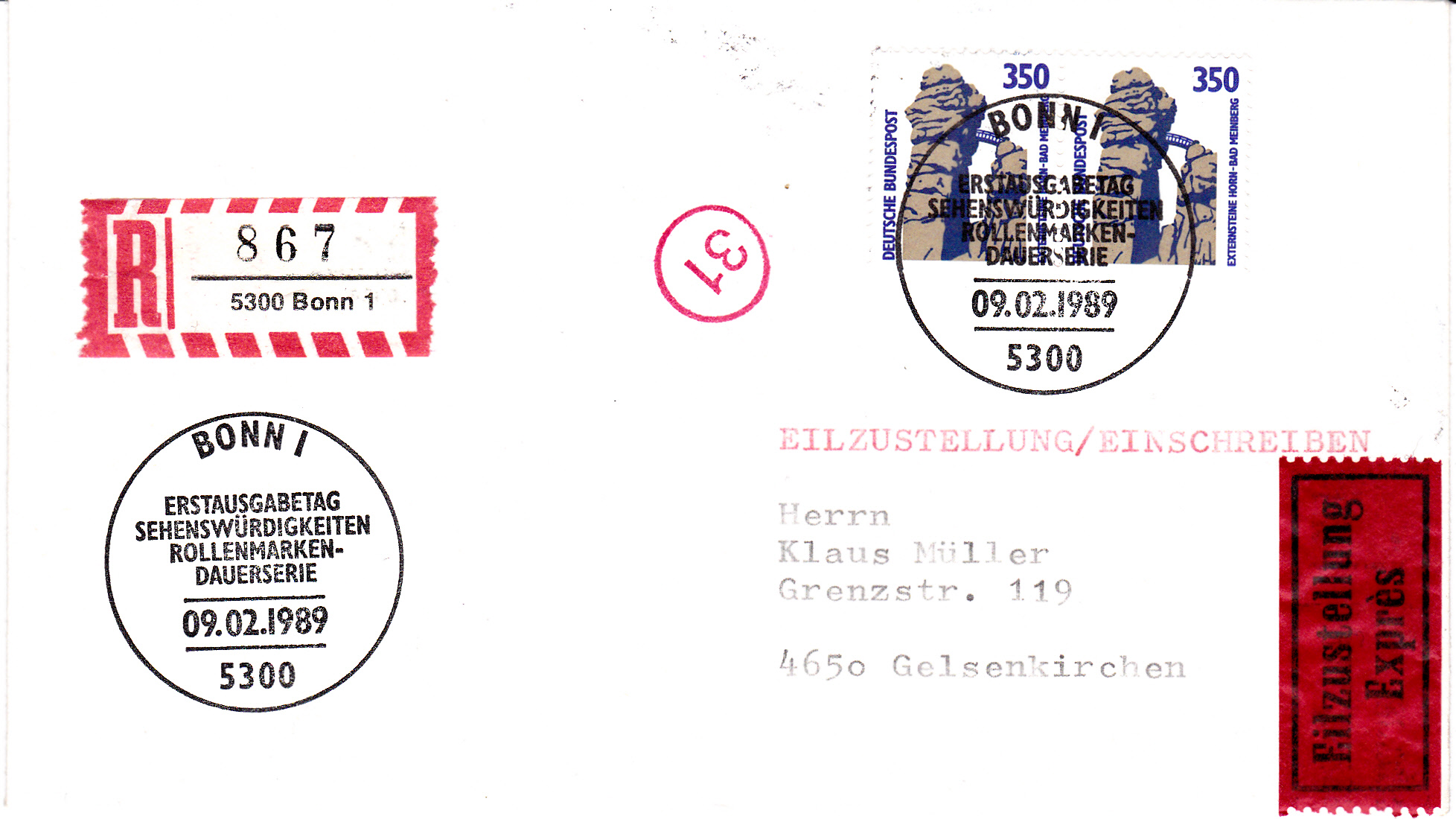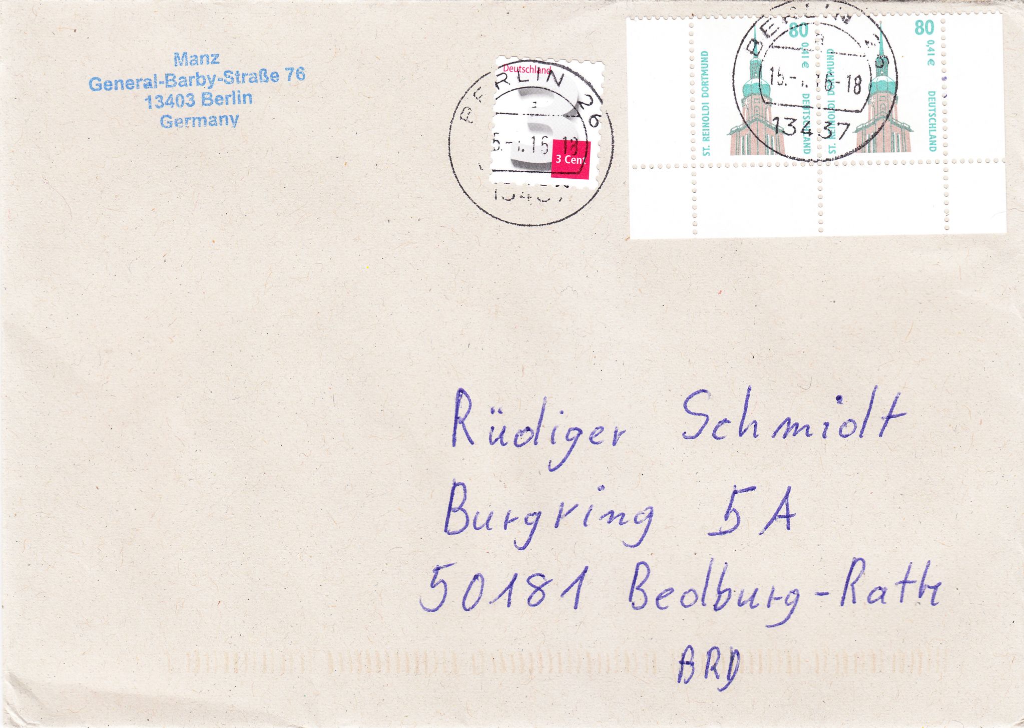 Demnach wurde der Beleg als "E E" = Einwurfeinschreiben aufgegeben, was im Jahre 2002 als Zusatzleistung 1,53 € kostete. Dazu kam das Briefporto für einen Kompaktbrief, das 1,12 € betrug. Somit ist der mit 2,75 € frankierte Beleg leider um 0,10 € überfrankiert.