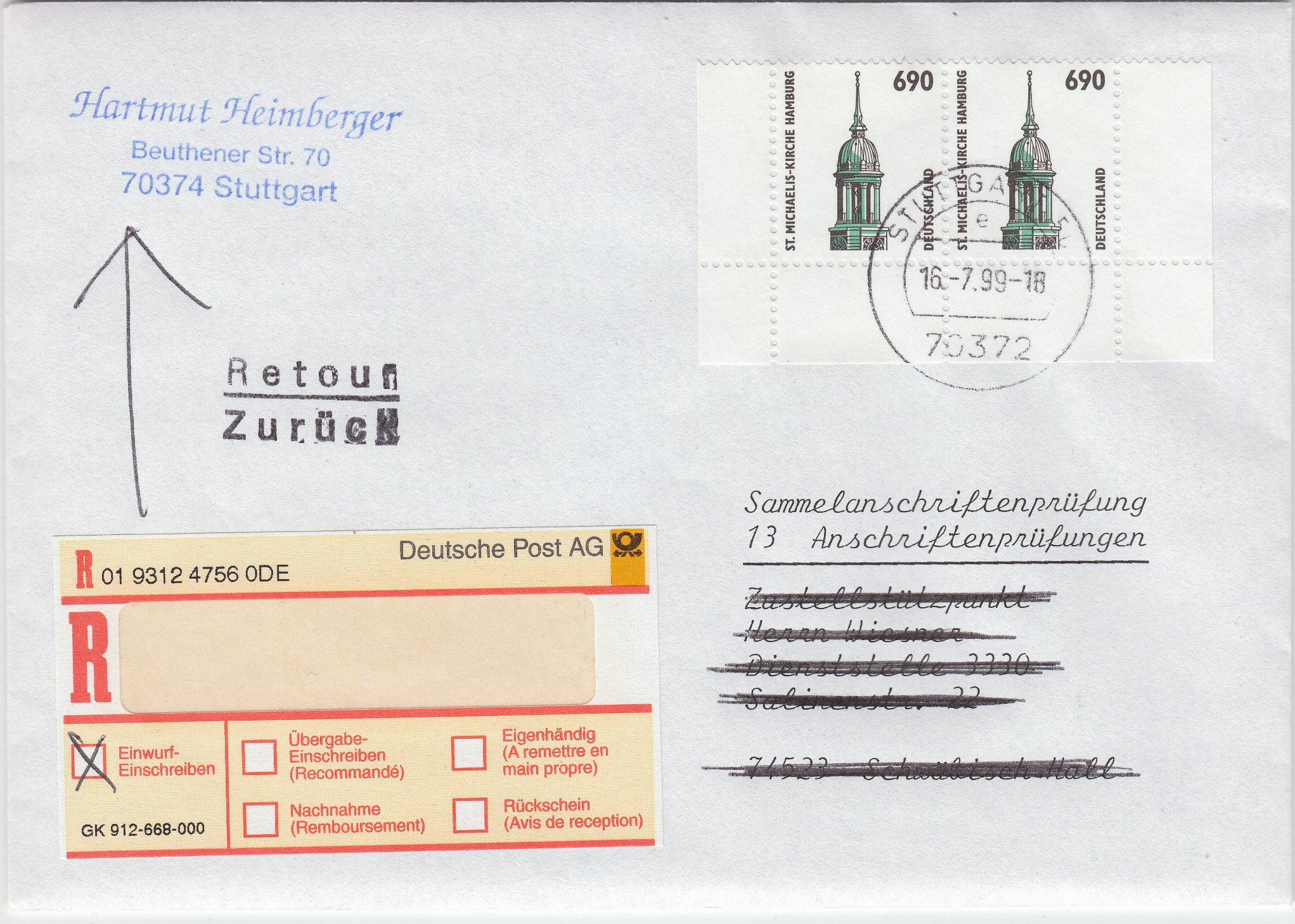 Paar der MiNr. 1860 vom Unterrand des Zehnerbogens, am 16.07.1999 portorichtig auf Sammelanschriftenprüfung von 13 Anschriftenprüfungen (je 60 Pf = 780 Pf) als Brief von 51 bis 500 g (300 Pf) per Einwurfeinschreiben (300 Pf):