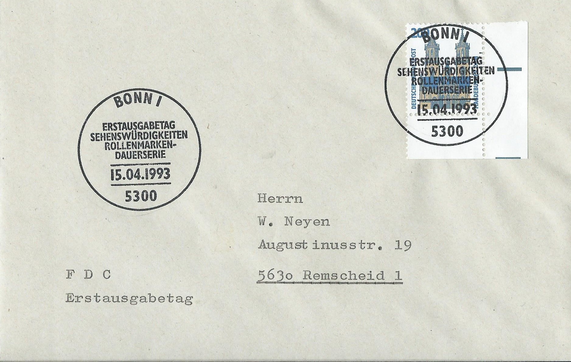 Der Wert zu 200 Pf aus der rechten unteren Bogenecke auf Ersttagsbrief mit einem Ersttagssonderstempel von Bonn vom 15.4.93: