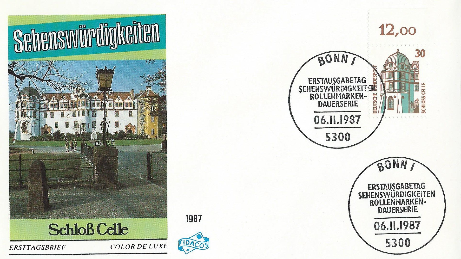 Der Wert zu 30 Pf vom Oberrand mit Reihenwertzähler 12,00 auf Ersttagsbrief mit Ersttagssonderstempel Bonn vom 6.11.87: