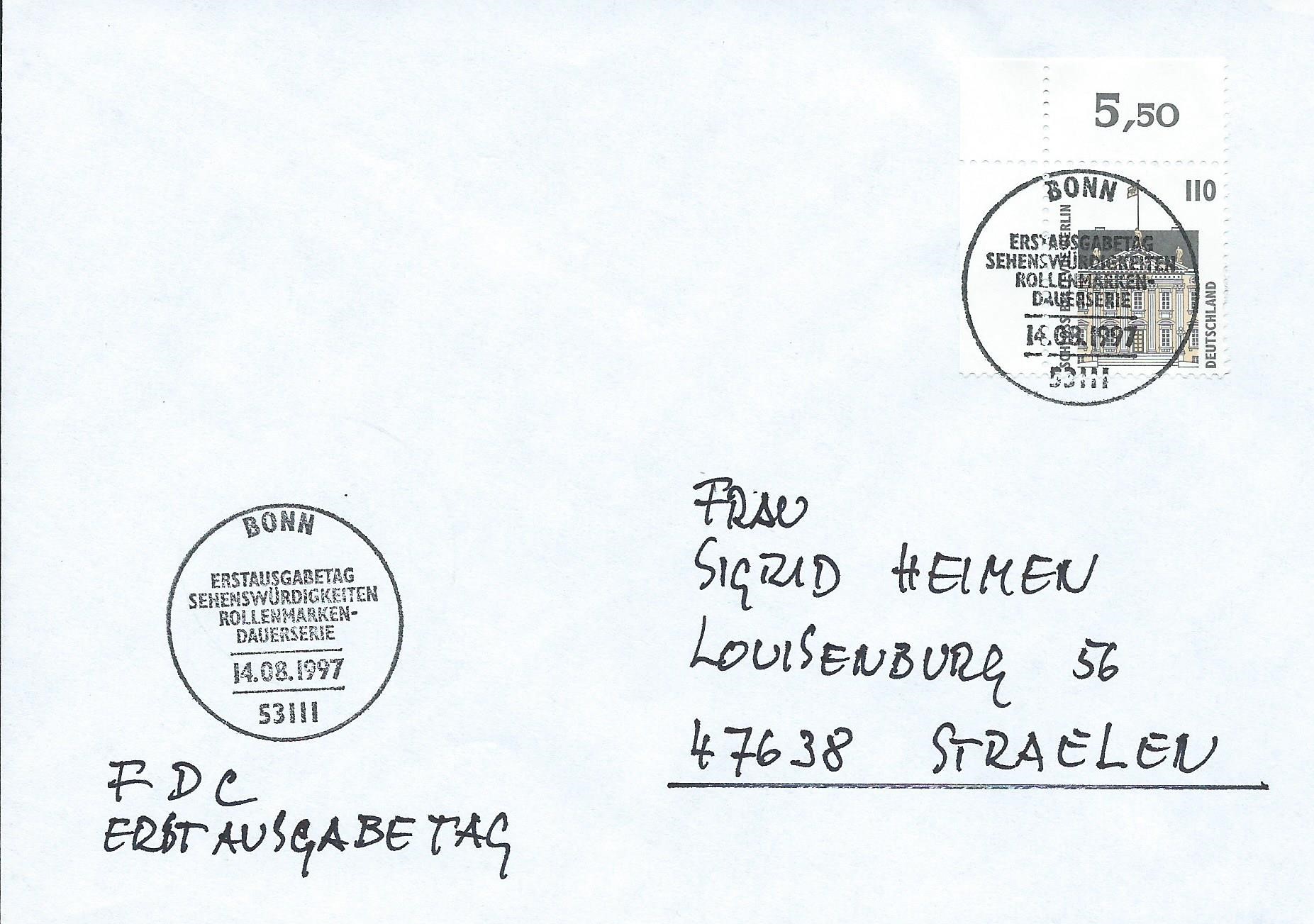 Der Wert zu 110 Pf aus der linken oberen Bogenecke auf Ersttagsbrief mit einem Ersttagssonderstempel von Bonn vom 14.8.97: