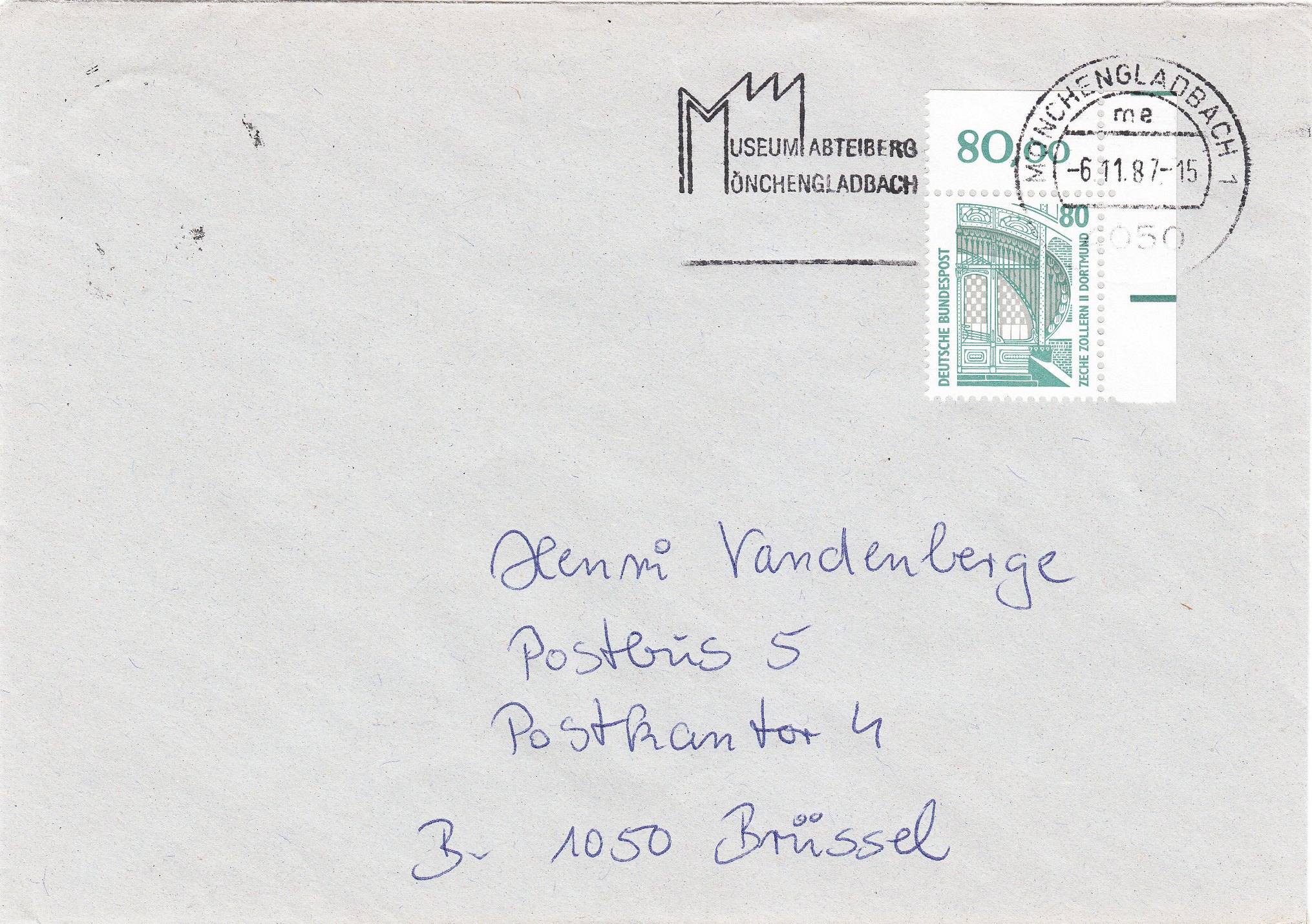 Rückseitig findet sich ein Ankunftsstempel aus Brüssel vom 10.11.1987: