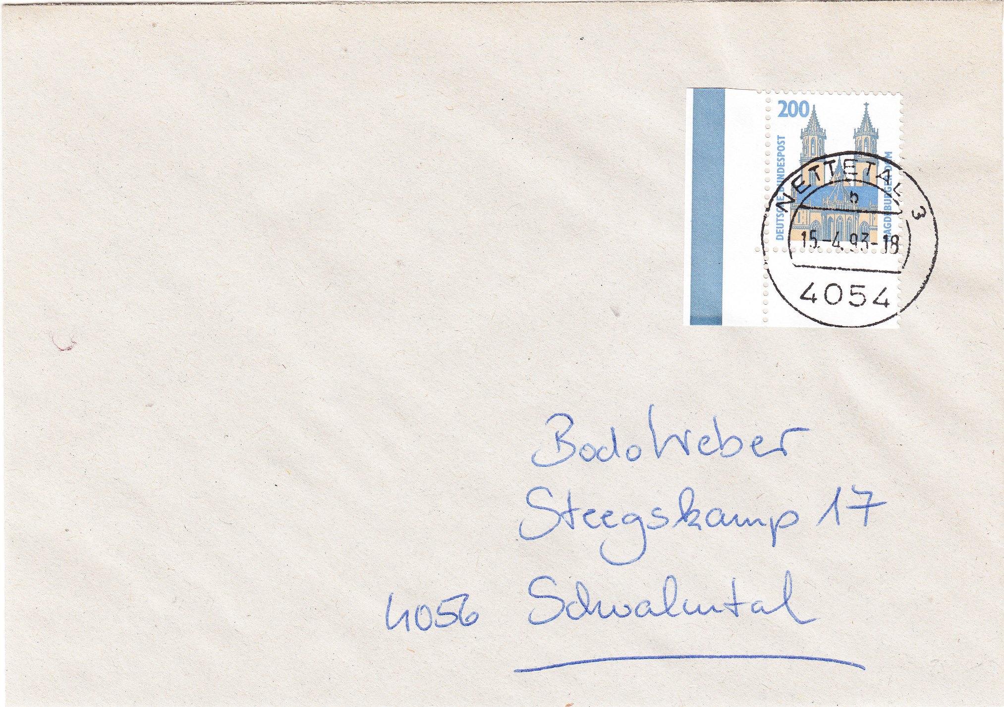 Da ab dem 01.07.1993 die neuen, seitdem fünfstelligen Postleitzahlen gelten sind Belege mit dieser Marke und vierstelliger Postleitzahl echt Mangelware am Markt, also gilt dementsprechend "Augen auf bei Tausch und Kauf"!