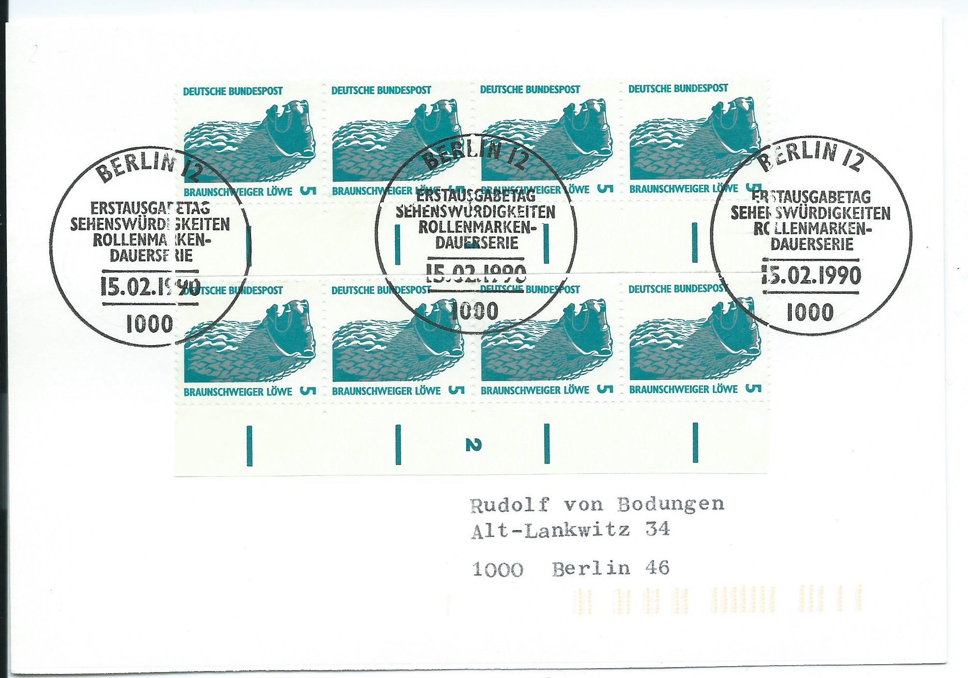Hier zum Beispiel 2 senkrechte 4-er-Streifen vom linken Rand mit Formnummer 1 und 2 auf einer Ortspostkarte von Berlin zum Tarif 40 Pf mit Ersttagssonderstempel. Diese Karte ist sogar echt gelaufen, erkenbar an den Codierstreifen unten rechts.
