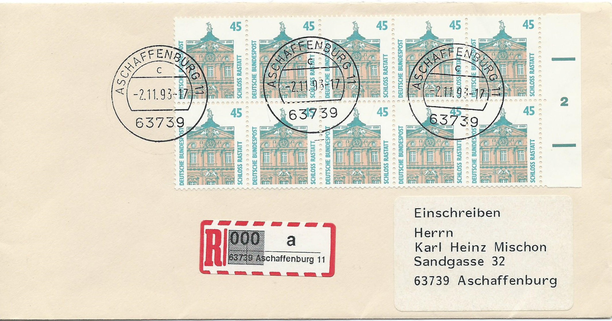 Einschreiben Portostufe 4,50 DM: Verklebt wurde ein waagerechter 10-er-Block 45 Pf-Marken vom rechten Rand mit Formnummer 2 gestempelt Aschaffenburg 2 vom 2.11.93. Auffallend ist hier noch der Einschreibzettel. Normalerweise durfte die Nummer 000 (also der 1000.e Zettel auf der Rolle) nicht benutzt werden, da am Schalter keine ordnungsgemäße Registrierung erfolgen konnte. Hier ist er aber trotzdem mal verwendet worden. Interessant auch die Schwärzung der 000, welche ja eigentlich den R-Zettel entwerten sollte ;) Ein wirklich interessanter Beleg!