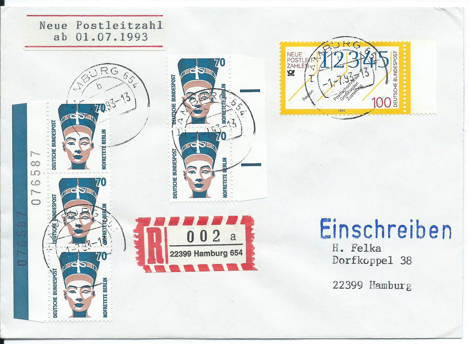 Es folgt ein Beleg, der eigentlich zur Dokumentierung der Einführung der neuen Postleitzahl am 1.7.1993 dienen sollte. Neben der Sondermarke zu diesem Thema kleben auch noch ein senkrechter 3-er-Streifen vom linken Rand mit 2 Bogenzählnummern und ein senkrechtes Paar vom rechten Rand mit den waagrechten Farbstrichen (so genannter Standstrich) der SWK 70 Pf Nofretete. Bei der Ausgabe SWK wurde am linken Rand immer die Bogenzählnummer einmal auf dem Farbbalken und einmal auf dem weißen Bogenrand gedruckt. Die Marken wurden gestempelt in Hamburg 654 am 1.7.93.