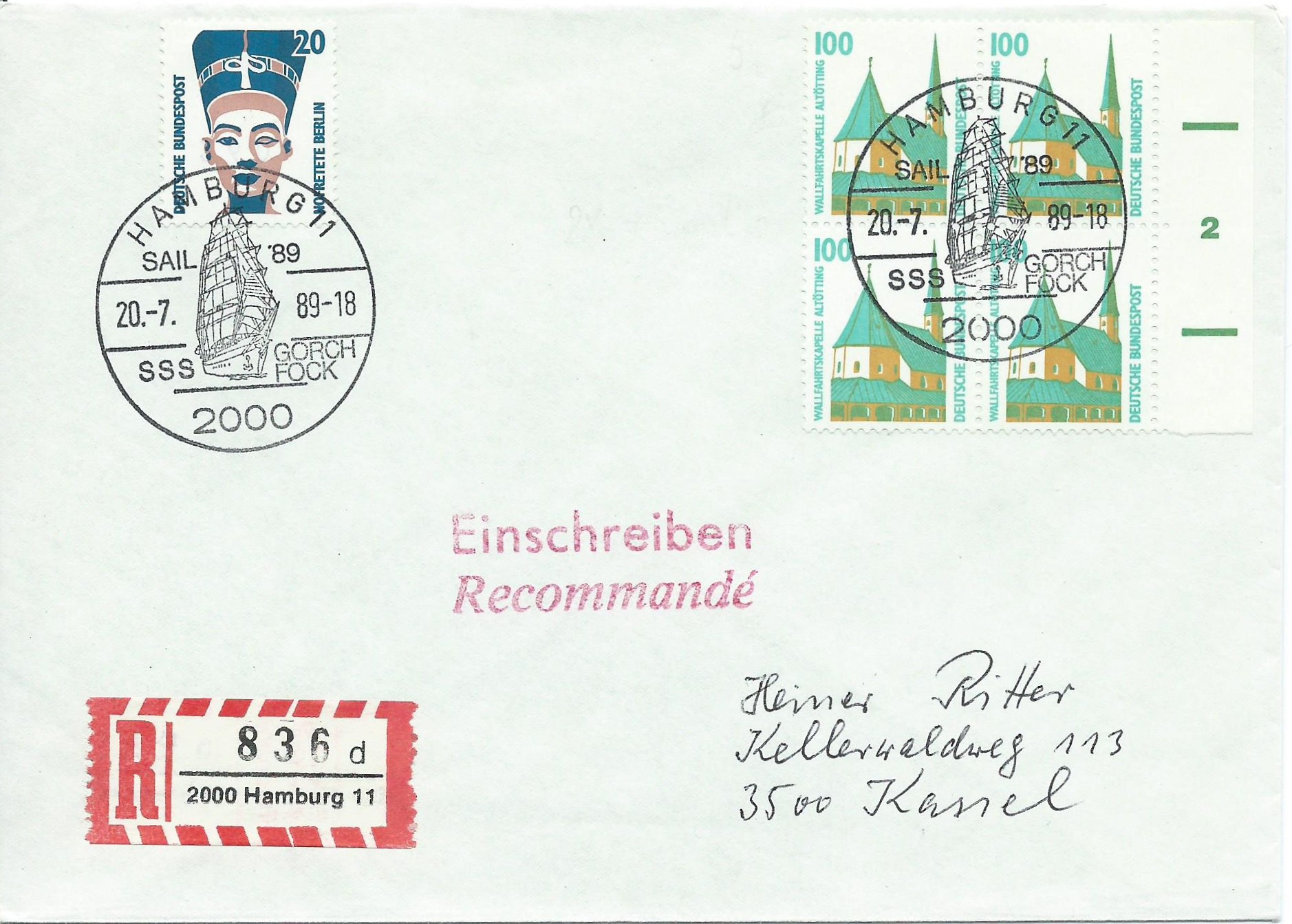 Als nächstes ein Einschreiben mit einer einzelnen SWK 20 Pf-Marke und einem 4-er-Block 100 Pf mit Formnummer 2. Die Marken haben einen schönen Sonderstempel aus Hamburg mit dem Motiv Gorch Fock vom 20.7.89.