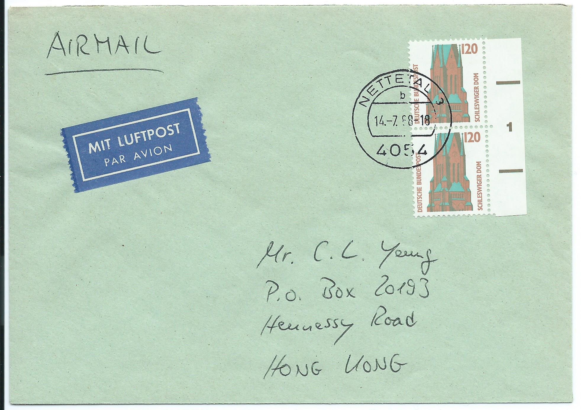 Es folgt der Wert zu 120 Pf: Senkrechtes Paar auf einem Luftpostbeleg nach Hong Kong mit schönem rechten Seitenrand und Formnummer 1. Abgestempelt in Nettetal 3 am 14.7.88, so ganz nebenbei also noch ein Ersttagsbrief ;)
