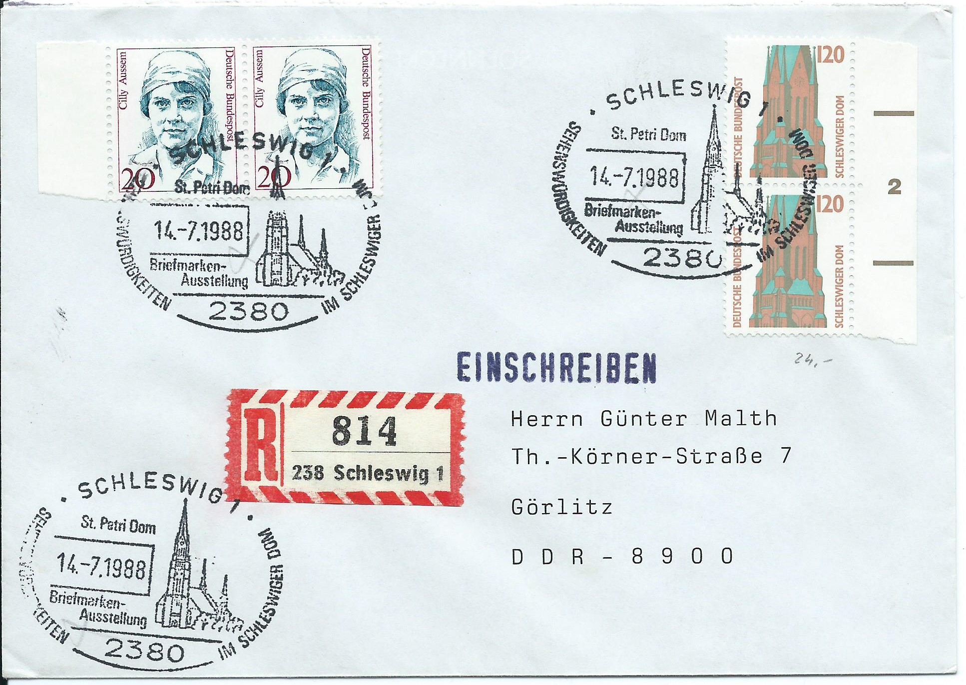 Wer 1 sagt, muss auch 2 sagen :D Daher die Formnummer 2 im senkrechten Paar gleich hinterher, zusammen wir einem waagerechten Paar der Frauen 20 Pf. Schön an dem Beleg ist, dass es einen Bezug des Stempels zur SWK-Marke gibt. Die Marke zeigt den Schleswiger Dom und der Stempel aus Schleswig ebenfalls. Der R-Zettel aus Schleswig macht sich auch sehr gut dazu. Unnötig zu erwähnen, dass es wieder ein Ersttagsbrief der 120 Pf-Marke ist (14.7.88). ;)