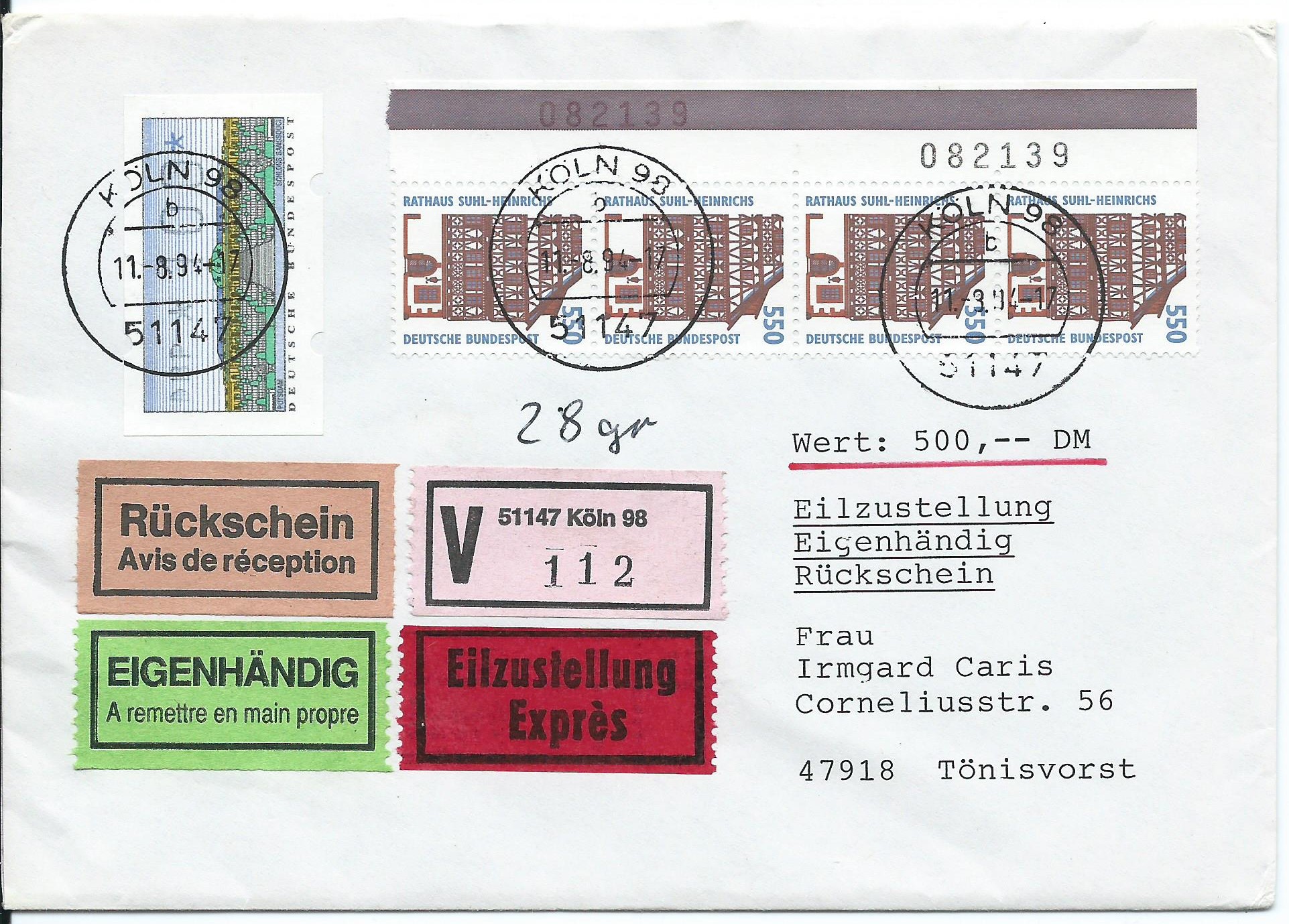 Als letzten Beleg für heute zeige ich den Wert zu 5,50 Pf im senkrechten 4-er-Streifen mit Bogenzählnummern zusammen mit einer ATM zu 100 Pf. Hier sind wohl alle Möglichkeiten ausgereizt, die auf einer Sendung machbar sind: Eil-Wertbrief Eigenhändig und Rückschein. Geht noch mehr? Ich denke nein. Abgestempelt wurde der Beleg in Köln 98 am 11.8.94, hier schon mit 5-stelliger Postleitzahl und ohne den Zusatz Flughafen.