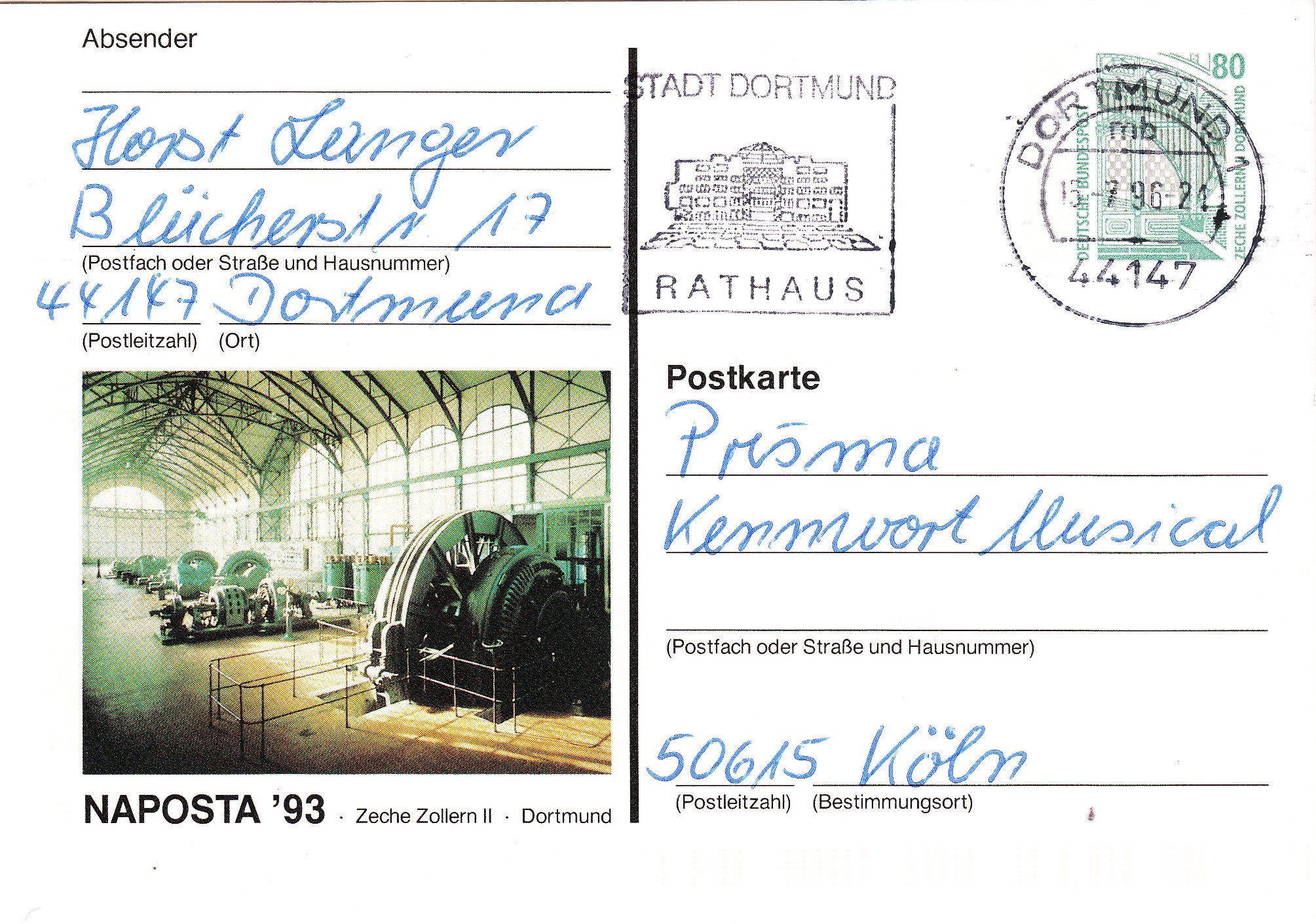 Hier ein weiteres Exemplar der Privatpostkarte Zeche Zollern zur NAPOSTA ´93, ebenfalls "am Ort" entwertet per Maschinenstempel in DORTMUND 1, aber mit anderer Schriftart im Stempel: