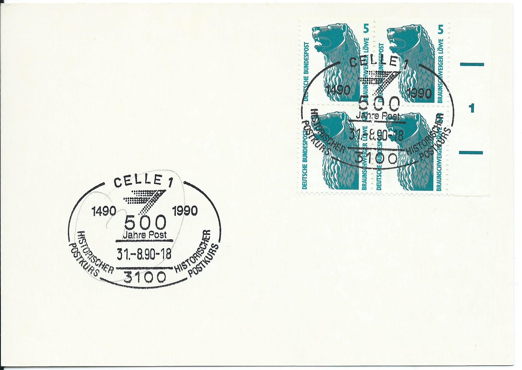 Hier eine Stempelvorlagenkarte mit dem Wert zu 5 Pf als 4-er-Block und der Formnummer 1 im rechten Rand. Entwertet wurden die Marken mit einem Sonderstempel von Celle vom 31.8.90.
