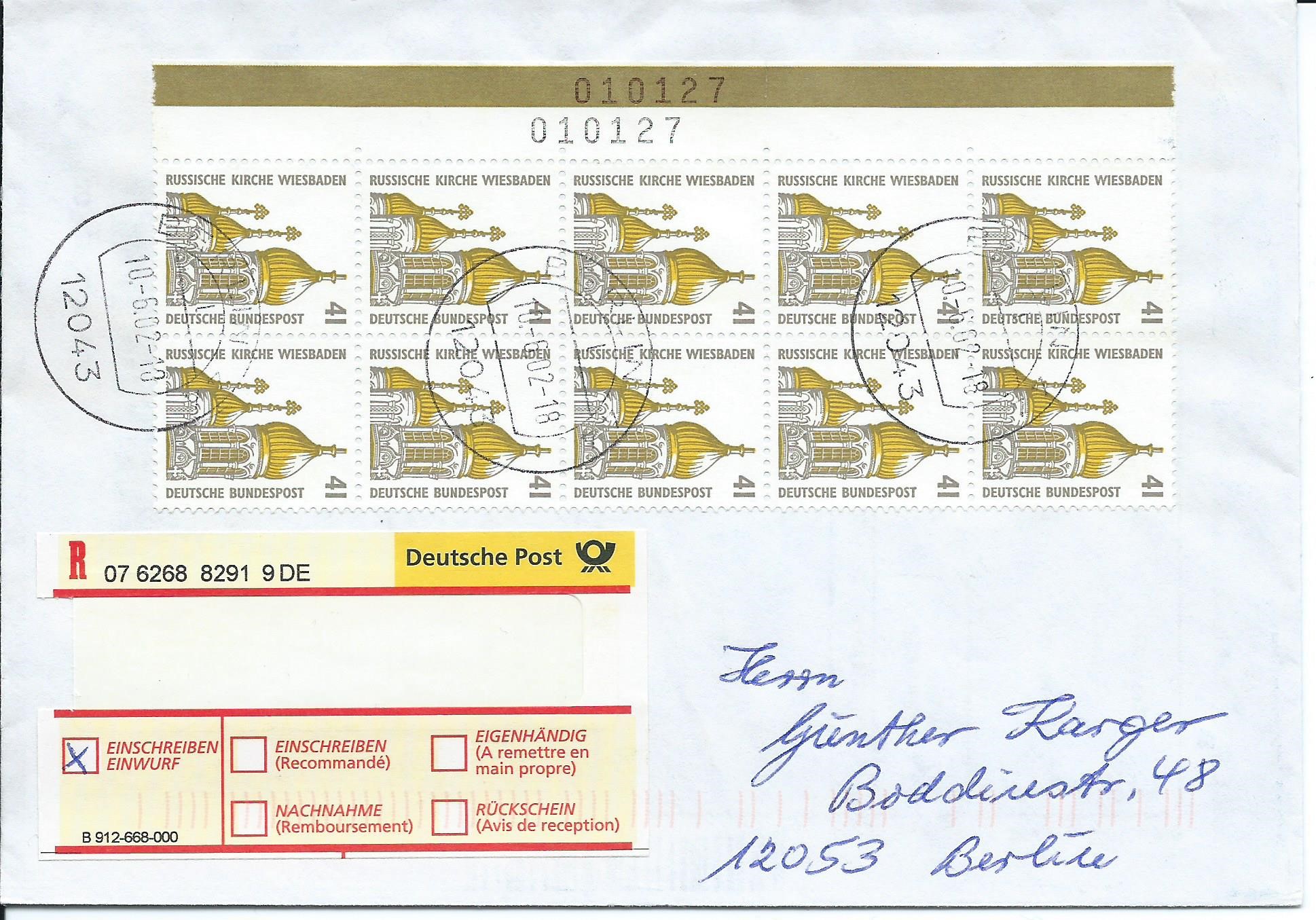 Hier nun ein Schmuckstück: 10-er-Block der Marke zu 41 Pf und Bogenzählnummer im linken Rand. Das Ganze auf einem Einschreibbrief, abgestempelt in Berlin am 10.6.02 (...kurz vor Ende der Gültigkeit der DM-Marken, diese waren ja bekanntlich bis 30.6.2002 noch frankaturgültig).