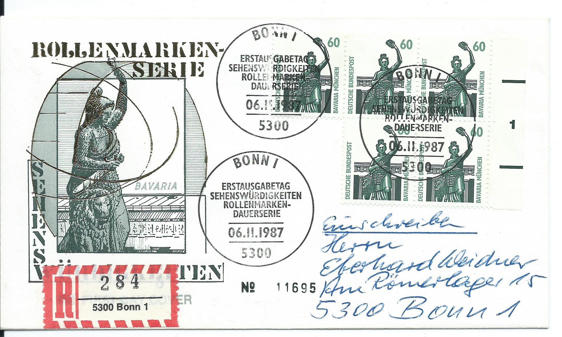 ) und Formnummer 1 verklebt. Das Ganze wurde dann mit dem Ersttagssonderstempel von Bonn vom 6.11.87 gestempelt und ist somit ein schöner Ersttagsbrief geworden.