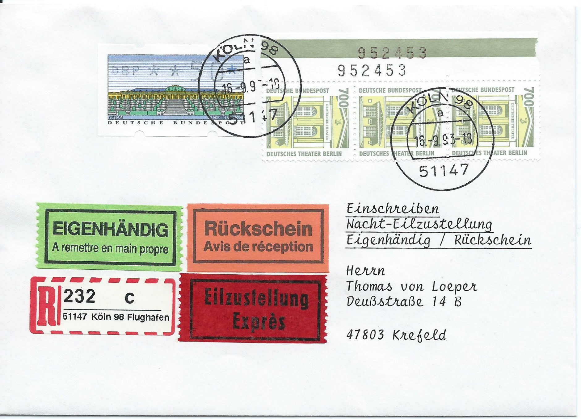 Als letzten Beleg das ganze Programm: Einschreiben-Eigenhändig-Rückschein-Eilbrief. Frankatur hier ein senkrechter 3-er-Streifen 700 Pf mit einer Automatenmarke 2.1 zu 50 Pf, abgestempelt in Köln am 16.9.93. Interessant ist hier noch der Unterschied von Tagesstempel und Einschreibzettel: Der Tagesstempel sagt nur aus "Köln 98", der Einschreibzettel ergänzt noch "Flughafen".