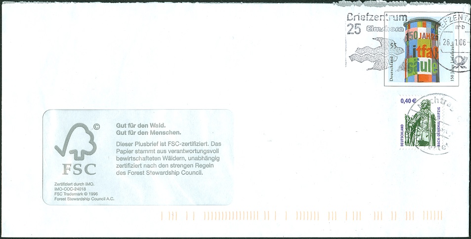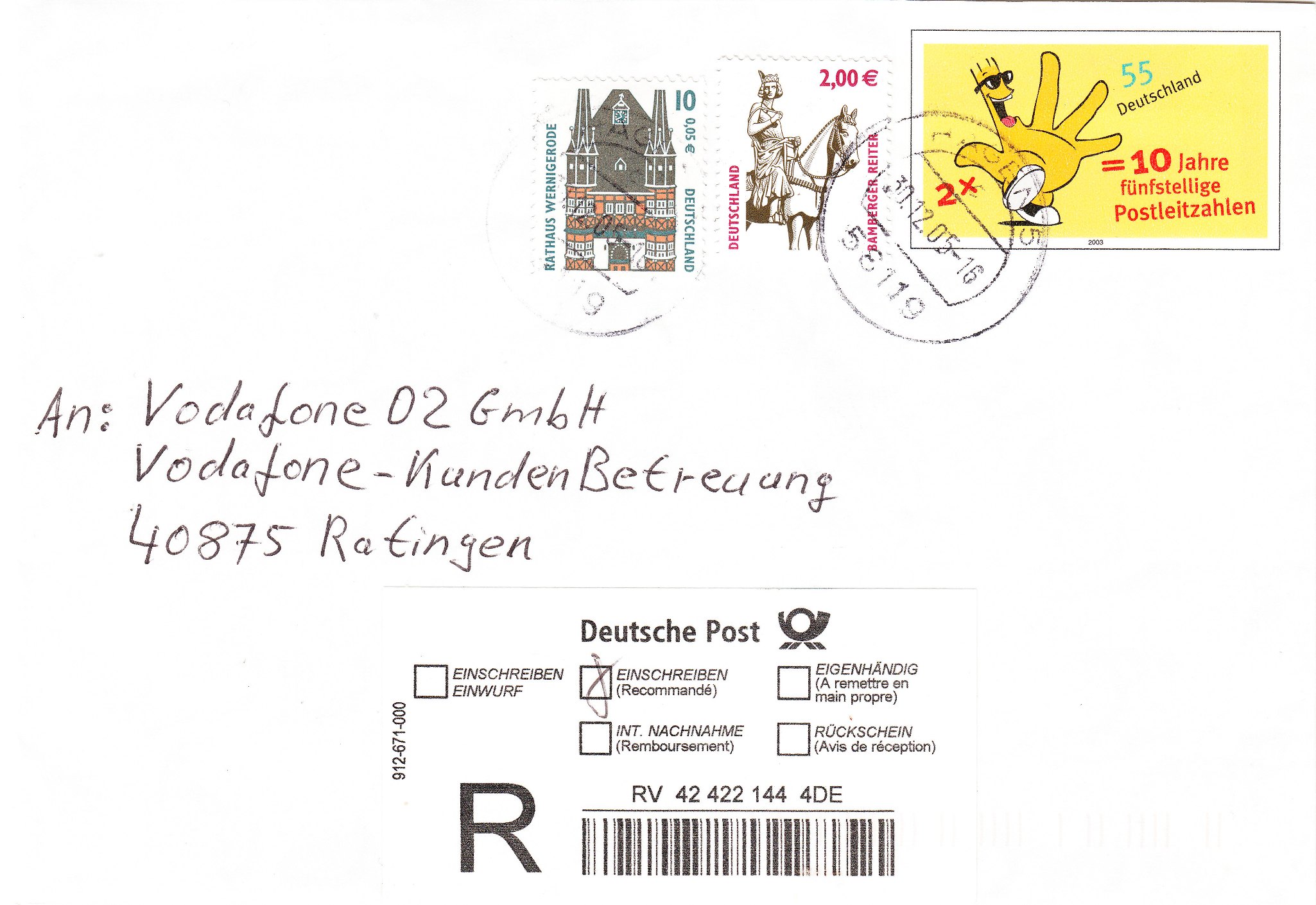 Dieses Exemplar wurde am 30.12.2005 als Standardbrief (0,55 €) per Übergabeeischreiben (2,05 €) freigemacht mit einer Zusatzfrankatur von einem Wert SWK zu 2,00 €, MiNr. 2314 xaII, mit Sicherheitsaufdruck IV = Aufdruck bis an die Zähnung gehend, in der Mitte freies Rechteck, sowie einem Wert SWK in Doppelnominale zu 10 (Pfennig) 0,05 €, MiNr. 2139 AR, mit Sicherheitsaufdruck I = vom Aufdruck ausgespart sind Zähnung, Bildteile, Schrift und Ziffern: