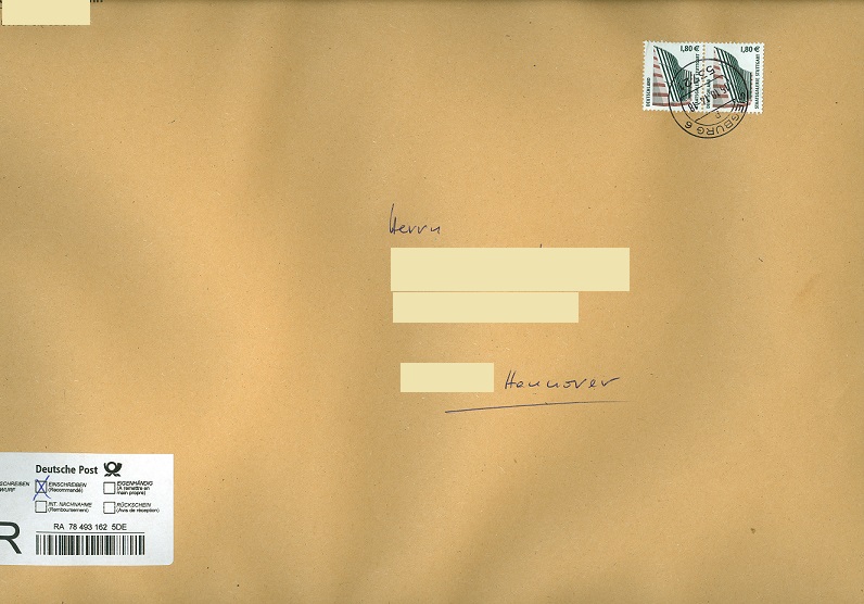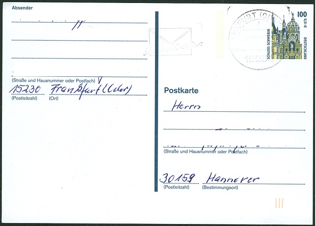 Hier eine 2001 postalisch gelaufene P 162 von Frankfurt/Oder nach Hannover.