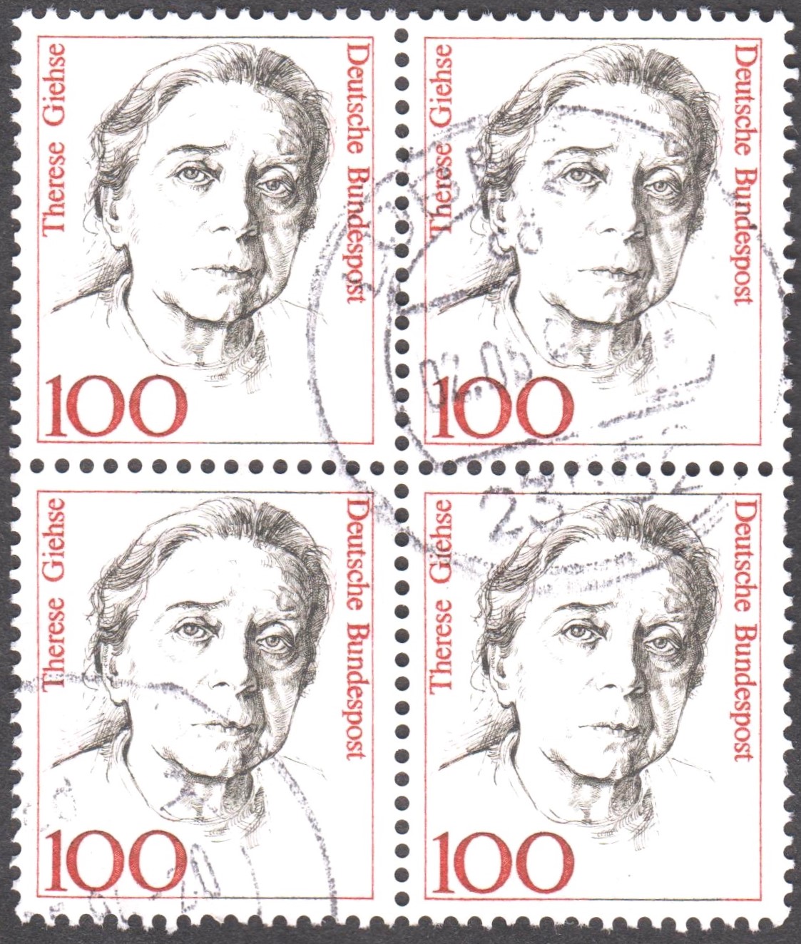 Viererblock zu 100 Pf, MiNr. 1390, gestempelt in LÜBECK: