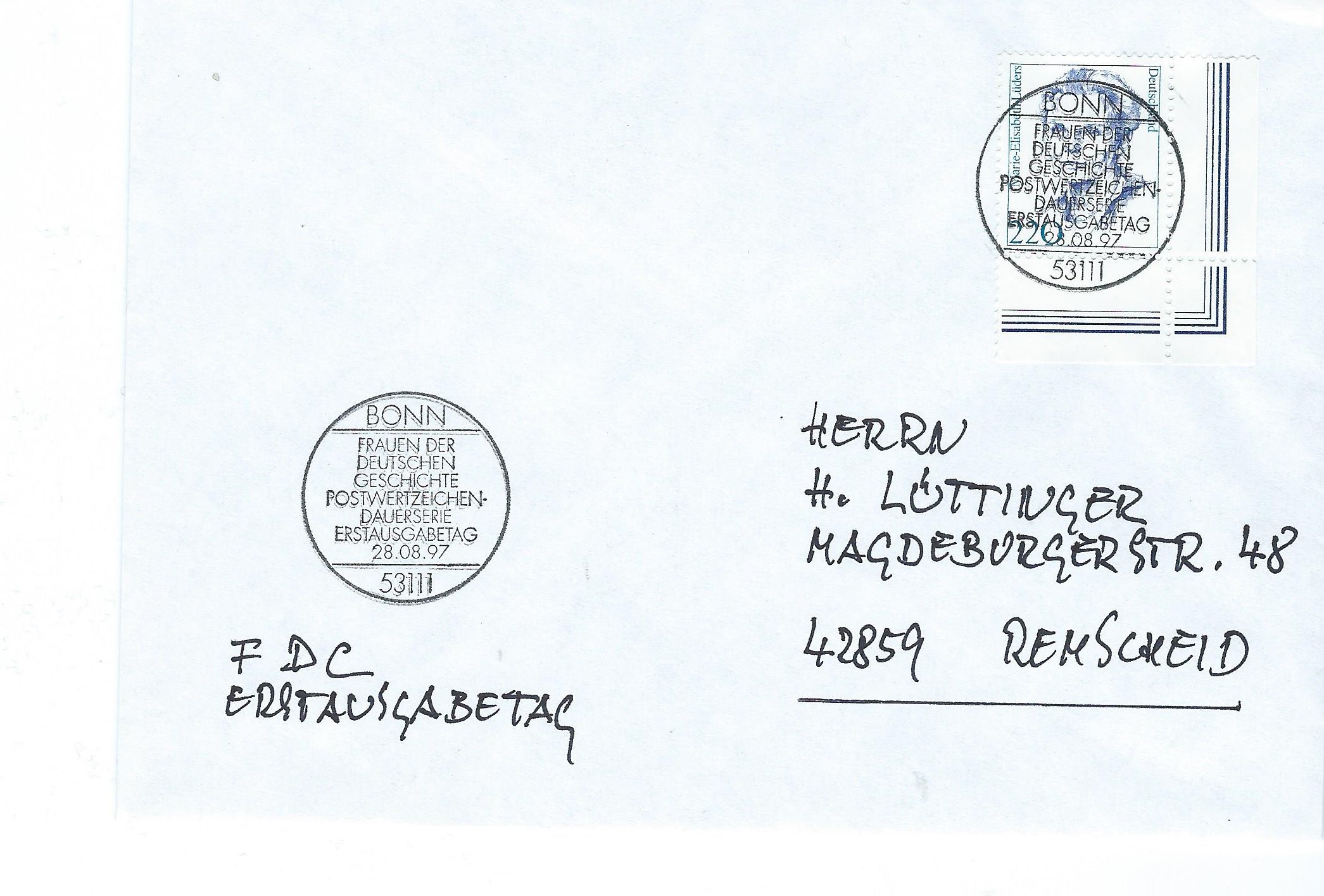 Gefolgt vom Wert zu 220 Pf, wieder aus der rechten unteren Bogenecke auf einem Ersttagsbrief. Gestempelt wurde hier mit dem Ersttagssonderstempel Bonn am 28.8.97.
