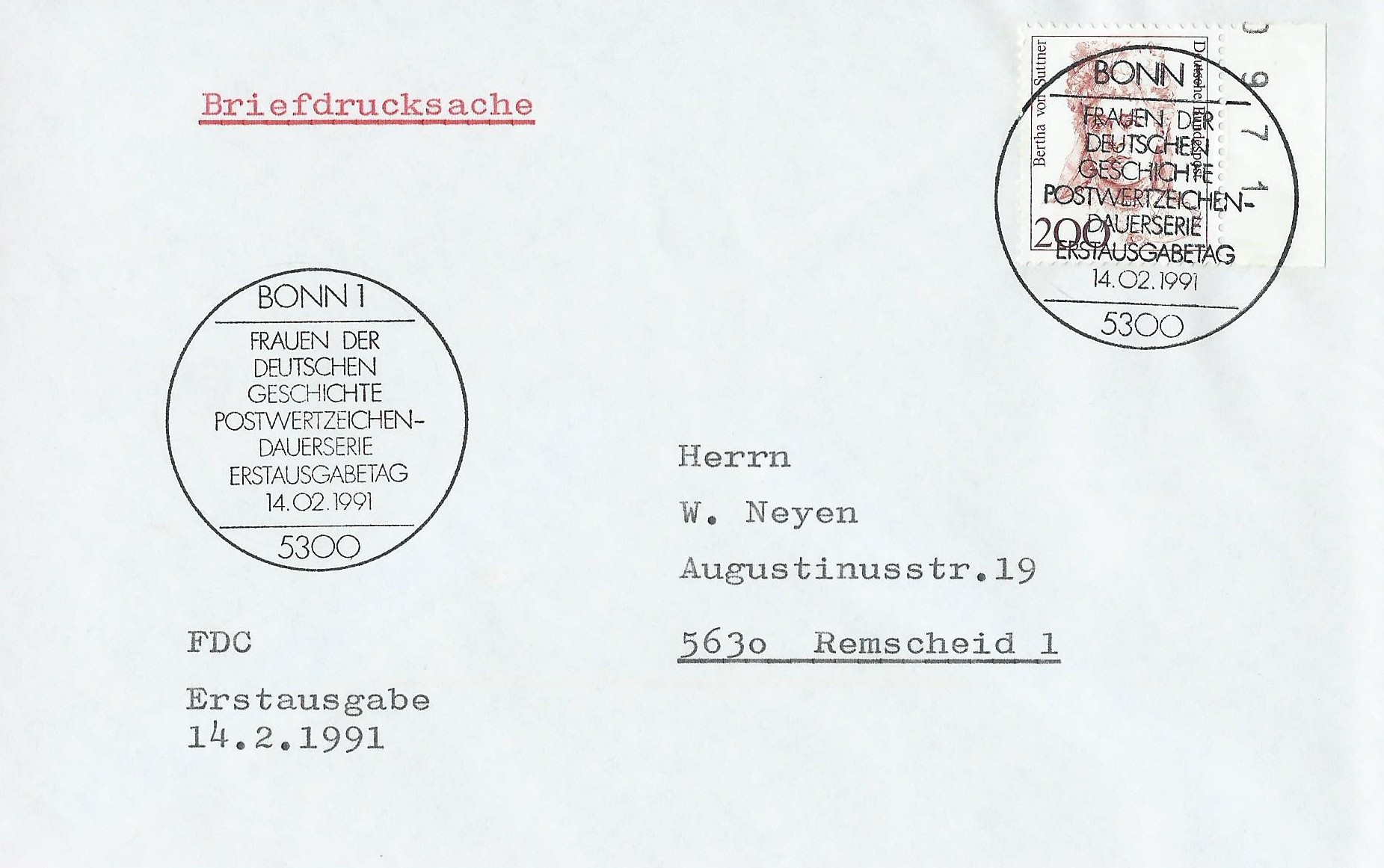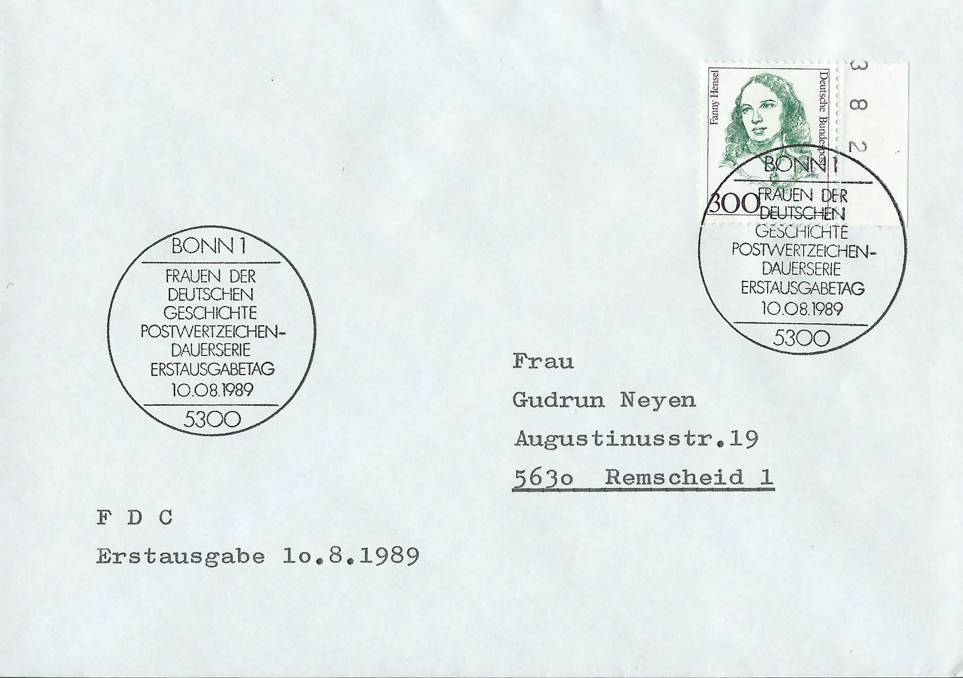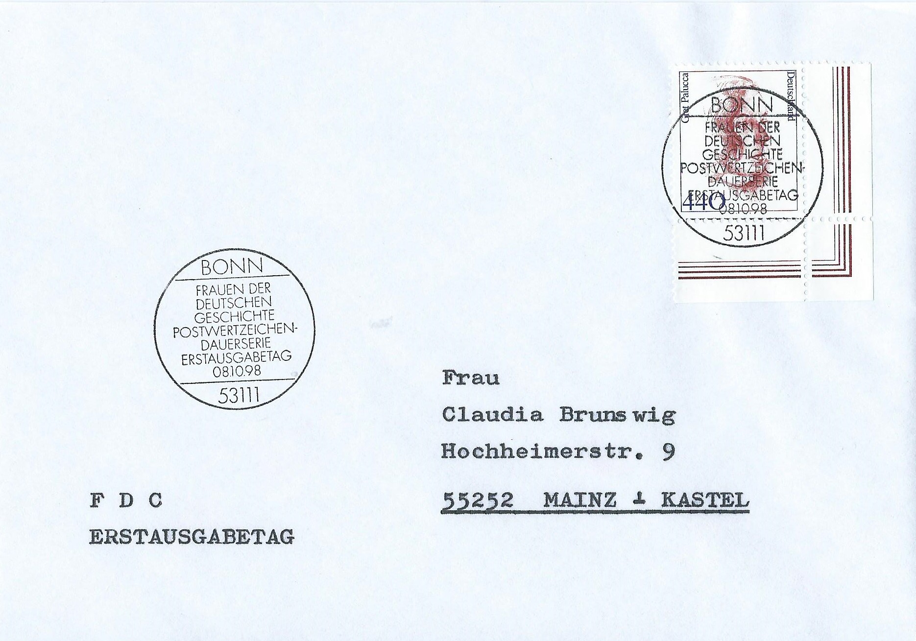 Und der letzte Wert diese Ausgabe ist der zu 440 Pf. Auf diesem Ersttagsbrief klebt auch wieder eine rechte untere Bogenecke und wurde mit dem Ersttagssonderstempel Bonn am 8.10.98 gestempelt.