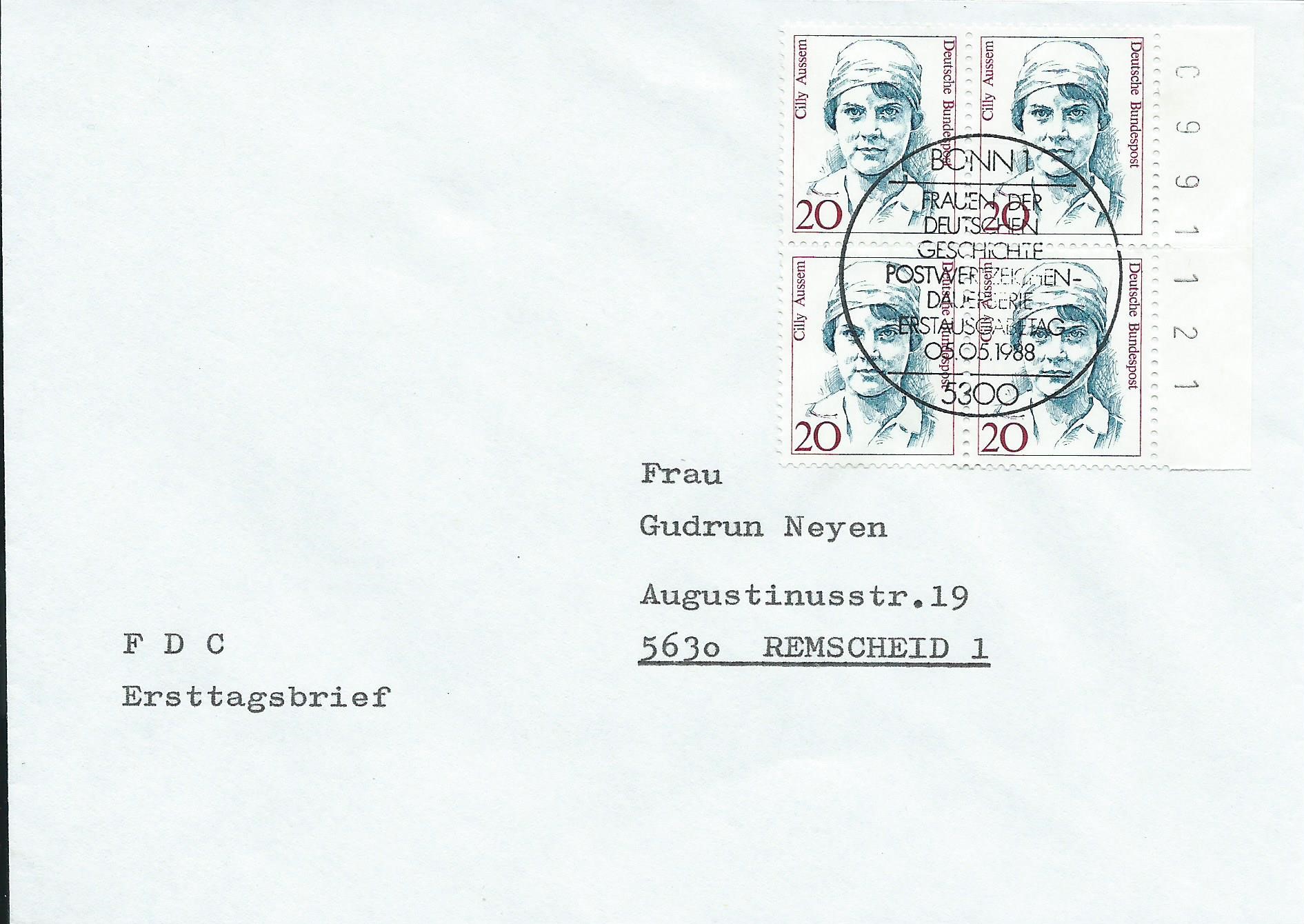 Nach den ganzen unvollständigen Bogenzählern nun mal eine komplette Bogenzählnummer: Ein 4-er-Block der Marke zu 20 Pf vom rechten Seitenrand und 6-stelliger Bogenzählnummer mit vorangestelltem Buchstaben auf einem Ersttagsbrief mit Ersttagssonderstempel Bonn vom 5.5.88: