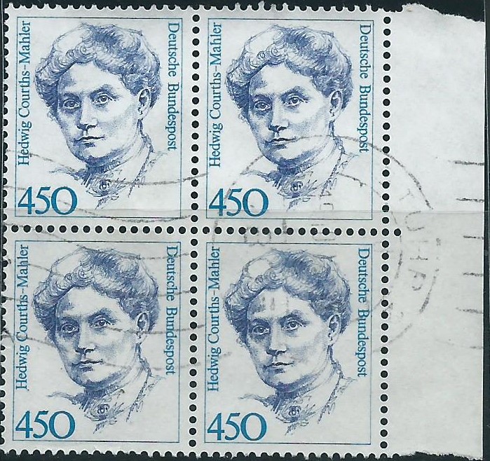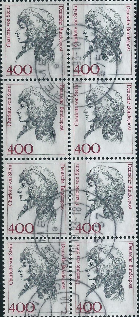 so etwas sieht man auch nicht alle Tage: Ein gestempelter senkrechter 8-er-Block der Marke Frauen zu 400 Pf, gestempelt am 10.1.93 in Bremen: