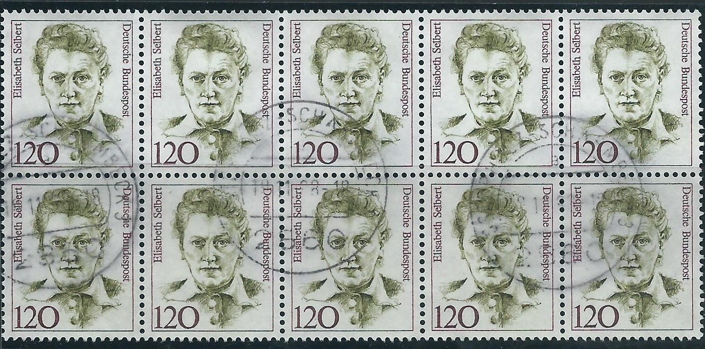 Dazu ein waagerechter 10-er-Block der Frauen-Marke zu 120 Pf, gestempelt am 10.11.88 in Osterholz-Scharmbek:
