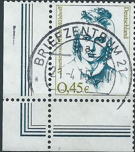 Der Wert zu 100 ct aus der linken unteren Ecke vom 10-er-Bogen, er wurde am 21.3.05 im Briefzentrum 24 gestempelt.