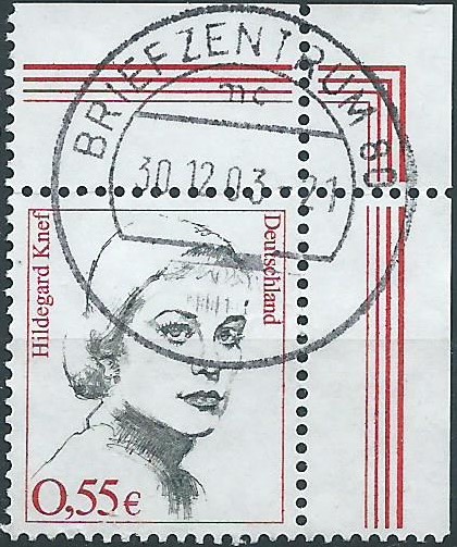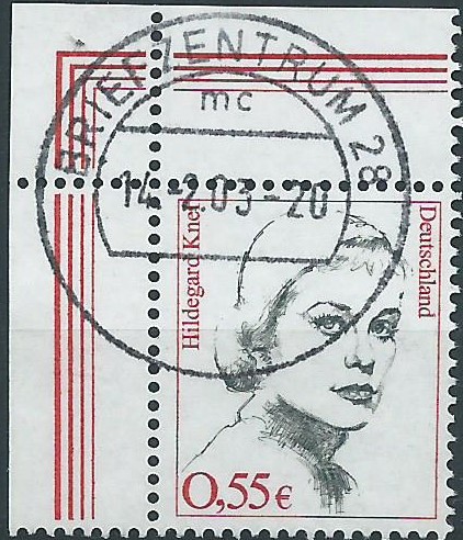 Der Wert zu 55 ct aus der rechten oberen Ecke vom 10-er-Bogen, er wurde am 30.12.03 im Briefzentrum 80 gestempelt.