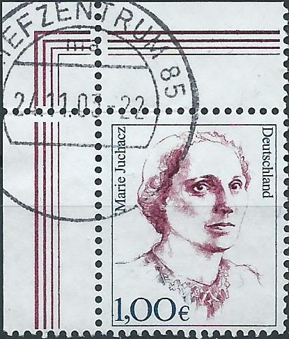 Der Wert zu 100 ct aus der linken oberen Ecke vom 10-er-Bogen, er wurde am 24.11.03 im Briefzentrum 85 gestempelt.