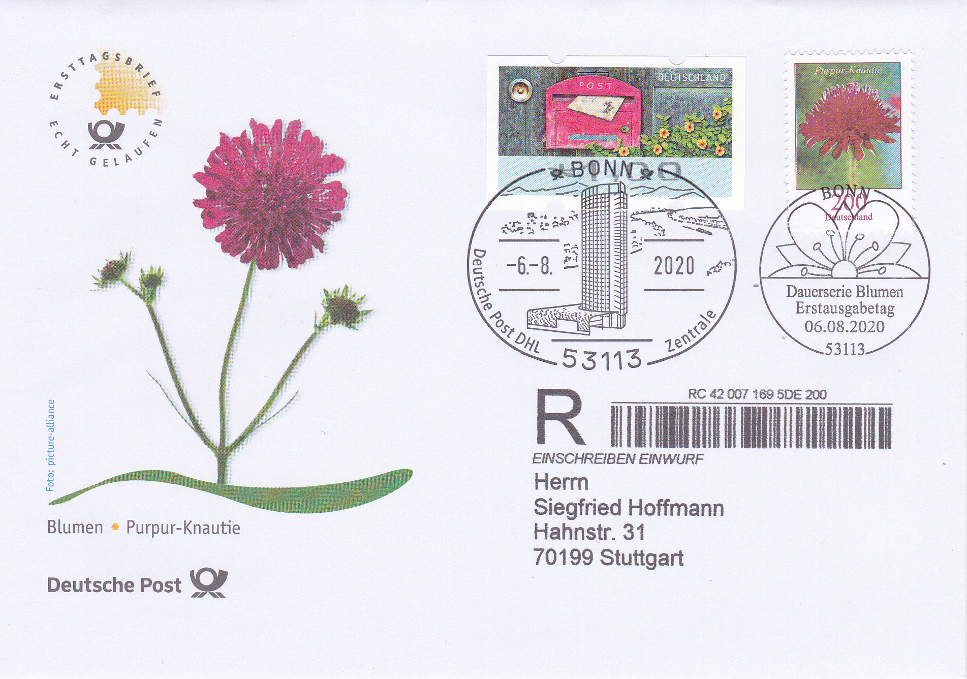 Ersttagsbrief per Einschreiben Einwurf mit der nassklebenden Marke zu 200 Cent (MiNr 3656) und der Zusatzfrankatur einer Automatenmarke zu 1,00€. Die Blumenmarke auf diesem Brief ist mit dem Ersttagsstempel Bonn entwertet, die Zusatzfrankatur mit einem Stempel der Deutschen Post DHL Zentrale in Bonn. Der "R-Zettel" wurde mit der Adresse direkt auf den Umschlag gedruckt.
