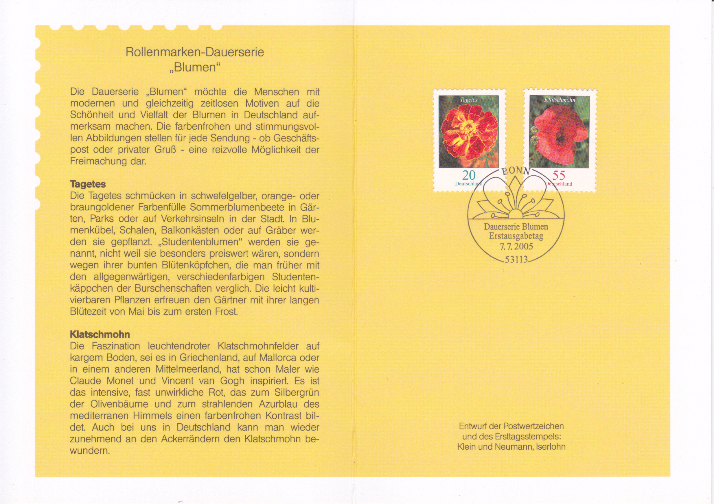 Klappkarte des Vorstandsvorsitzenden der Deutschen Post AG mit den Marken der Dauerserie "Blumen" zu 20 Cent mit dem Motiv "Hohe Studentenblume (Tagetes erecta)" (MiNr 2471 A) und 55 Cent mit dem Motiv "Klatschmohn (Papaver rhoeas)" (MiNr 2472)und dem Ersttagsonderstempel Bonn.
