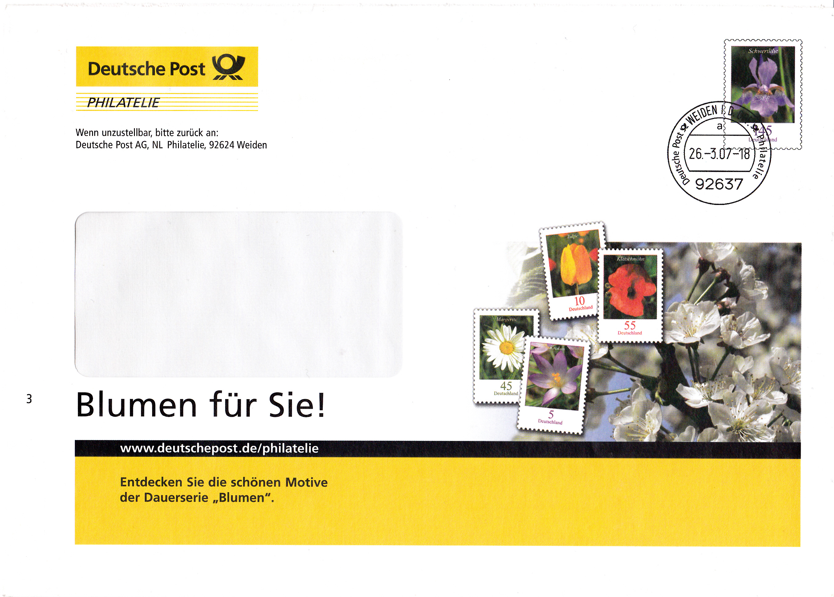 Dieser Ganzsachenumschlag (MiNr EA F 209) im Format 229 x 162 mm, eine Eigenausgaben der Deutschen Post AG - Postlogo "Deutsche Post/Philatelie", hat einen Wertstempel mit der 145 Cent Marke "Schwertlilie" aus der Bauerserie "Blumen". Die Vorausentwertung hat das Datum "26.-3.07-18".