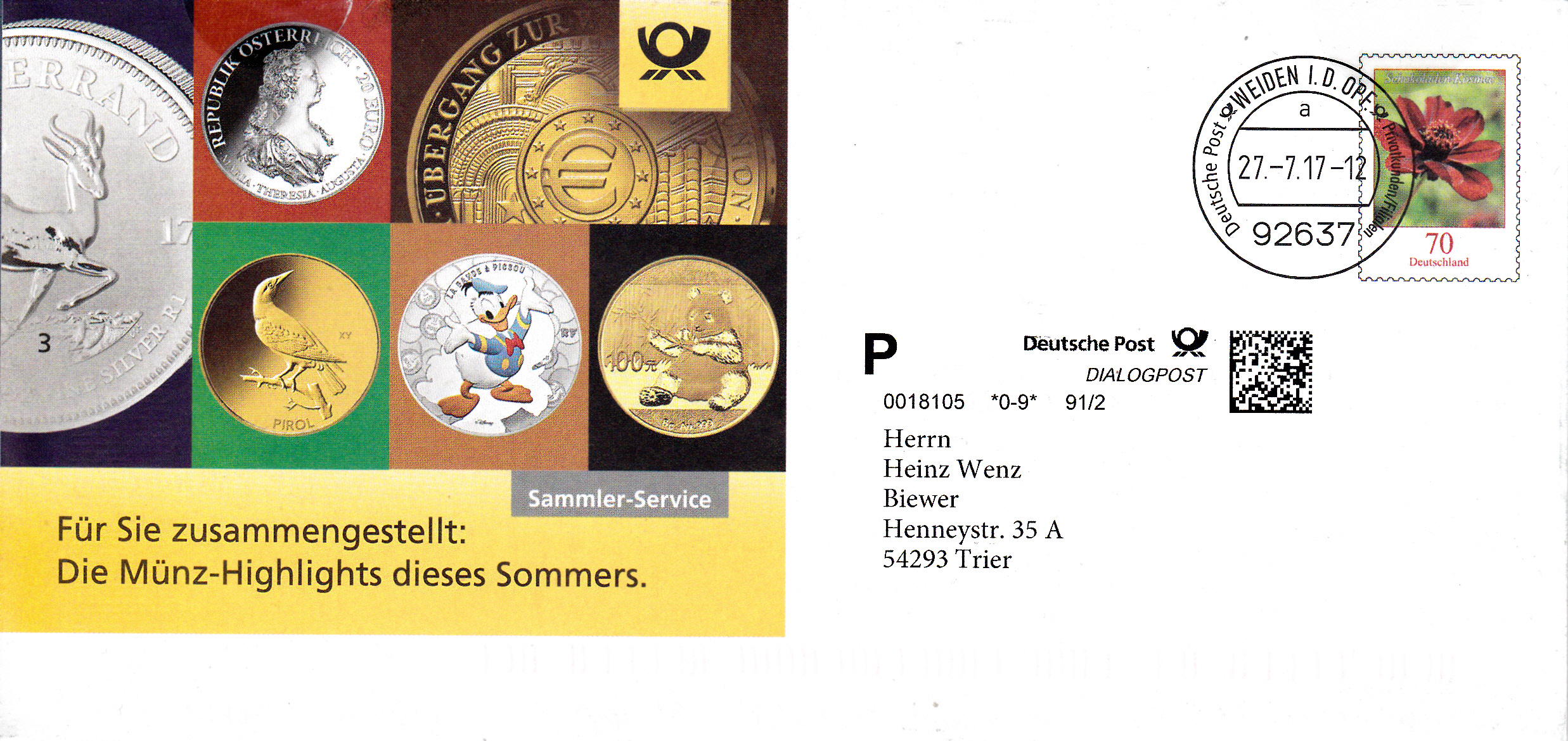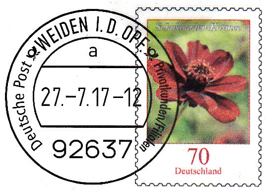 Dieser Faltbrief im Format 210 mm x 102 mm, eine Eigenausgabe der Deutschen Post AG - Postlogo (nur Posthorn), hat einen Wertstempel der 70C-Marke aus der Dauerserie Blumen" mit dem Motiv "Schokoladen-Kosmee" (MiNr 3189) mit aufgedruckter Zähnung und Vorausentwertung "Deutsche Post (Posthorn) WEIDEN I.D.OPF (Posthorn) Privatkunden/Filialen / a / 27.-7.17-12".