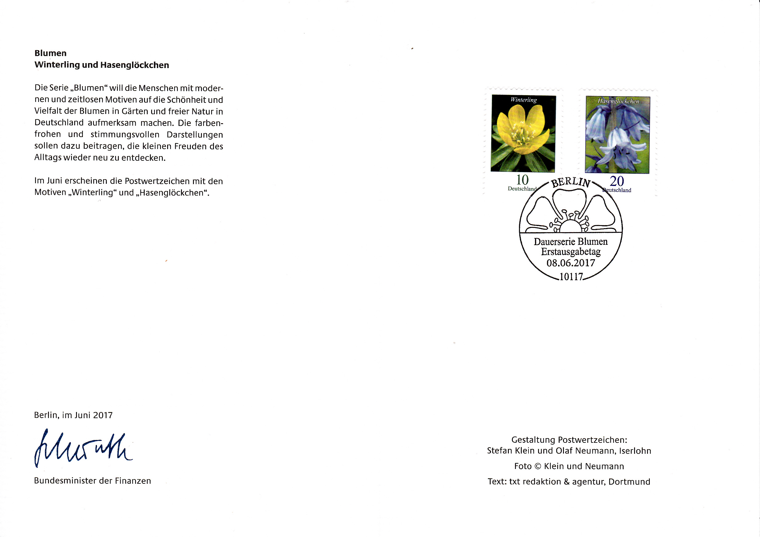 Ministerkarte des Finanzminister mit der 10 Cent-Marke mit dem Motiv "Winterling" (MiNr 3314) und der Marke zu 20 Cent mit dem Motiv "Atlantisches Hasenglöckchen" (MiNr 3315) aus der Serie "Blumen" vom Ausgabetag 8. Juni 2017 und mit dem Ersttagsonderstempel Berlin.