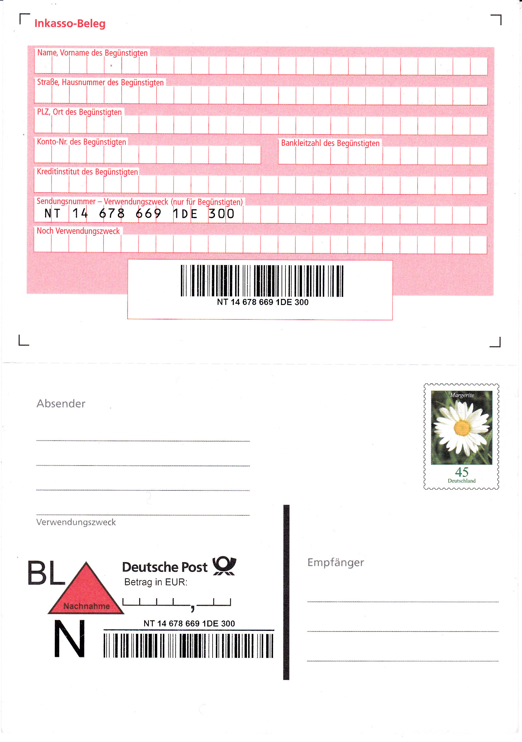 Nachnahmekarte mit Wertstempel "Margerite" (wie Marke MiNr 2451) mit aufgedruckter Zähnung und anhängender Inkassokarte (MiNr NK 1). Der Verkaufspreis war 45Cent + 240Cent für Nachnahme.