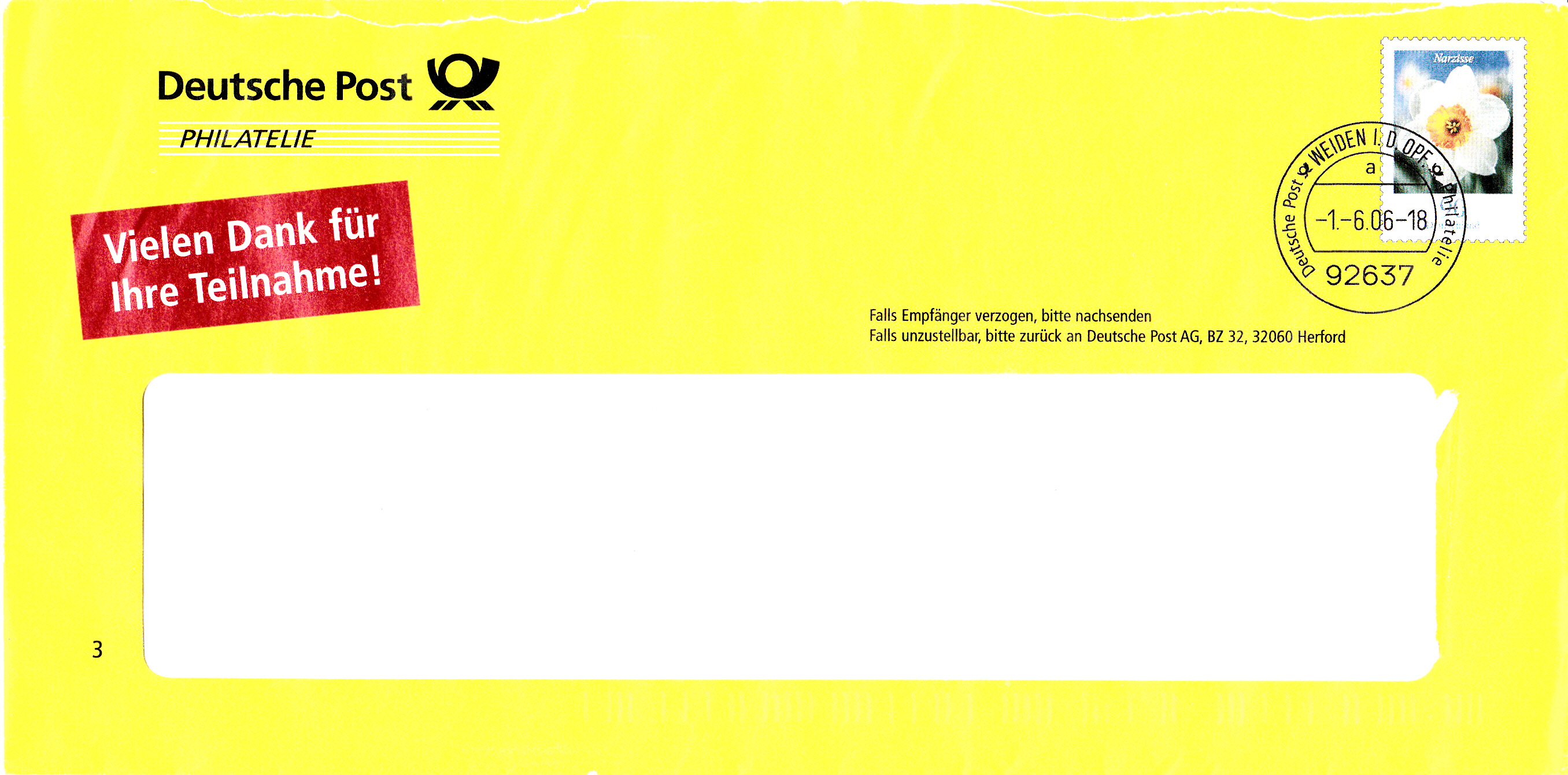Dieser Ganzsachenumschlag (MiNr EA F142) im Format 229x114 mm hat einen Wertstempel mit der 90 Cent-Marke der Dauerserie "Blumen" (Narzisse, MiNr 2506). Die Vorausentwertung trägt das Datum "-1.-6.06". Es ist eine Eigenausgaben der DP AG - Philatelie Weiden.