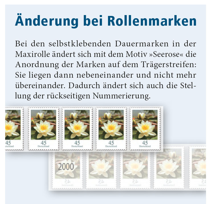 Bei den selbstklebenden Dauermarken in der Maxirolle ändert sich mit dem Motiv »Seerose« die Anordnung der Marken auf dem Trägerstreifen: Sie liegen dann nebeneinander und nicht mehr übereinander. Dadurch ändert sich auch die Stellung der rückseitigen Nummerierung."
