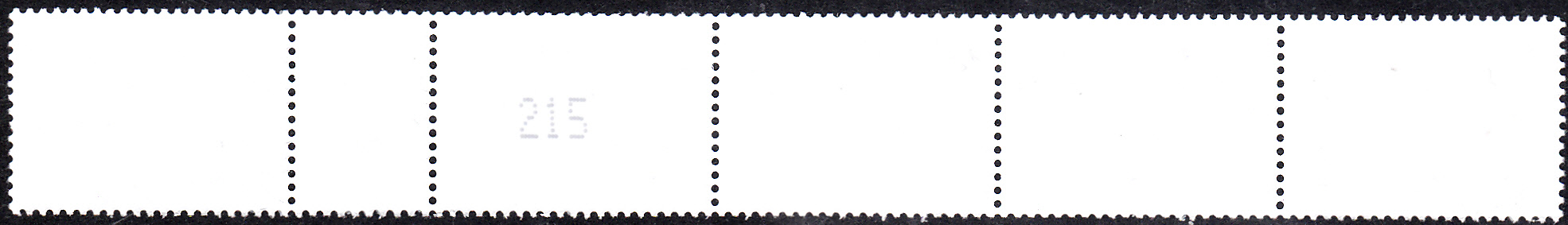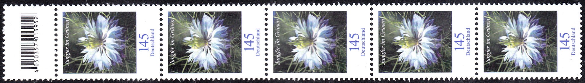 Diese Marke ist auch in 500er-Rollen erschienen. Hier ein Streifen von fünf Marken aus einer 500er-Rolle mit dem EAN-Code "4 050357 013952".