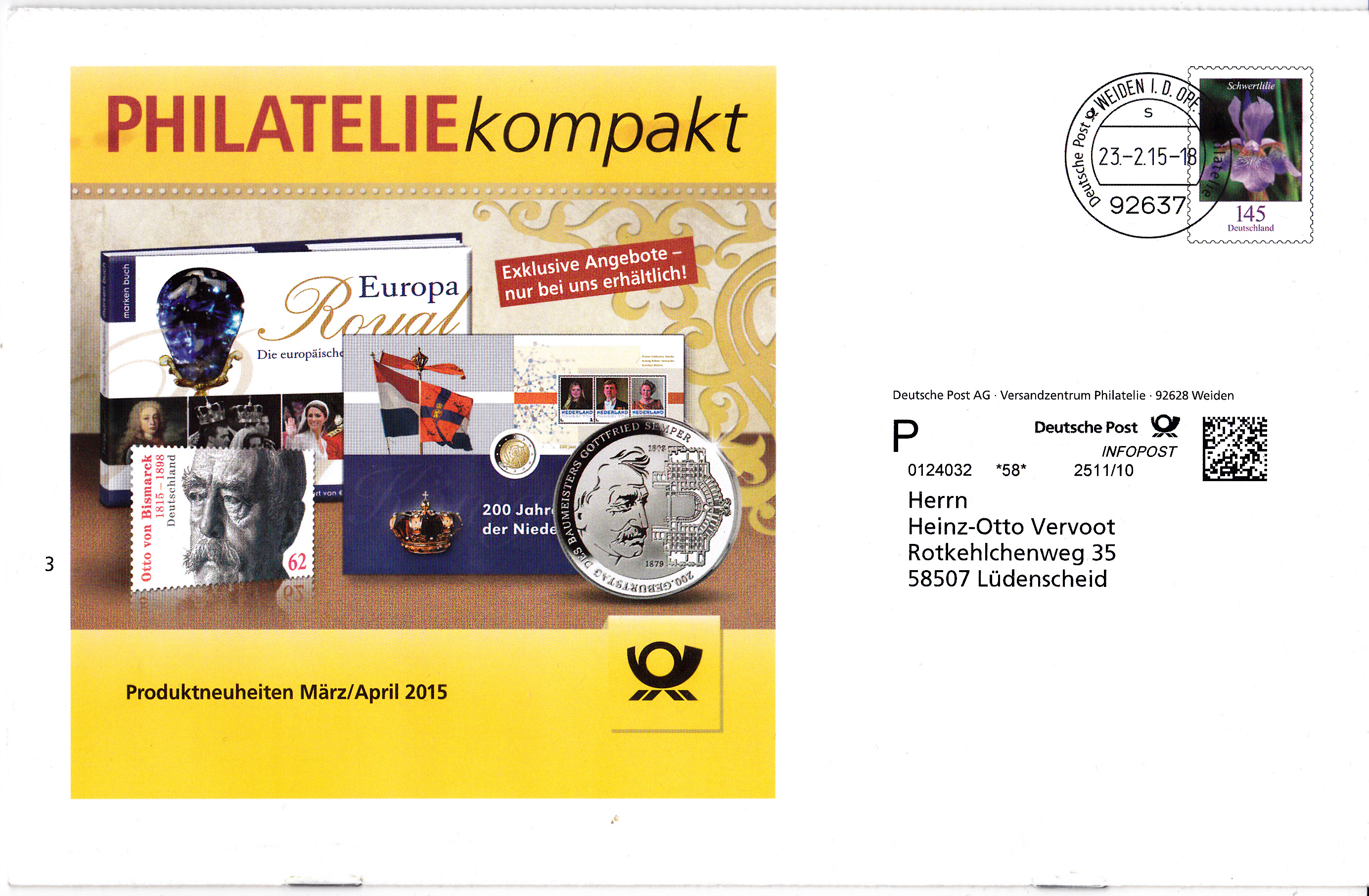 Diese Broschüre im Format 235 x 152 mm (unten geheftet) hat einen Wertstempel mit der 145 Cent Marke "Schwertlilie" aus der Bauerserie "Blumen". Die Vorausentwertung hat das Datum "23.-2.15-18". Es ist eine Eigenausgabe der DP AG Postlogo "Deutsche Post".