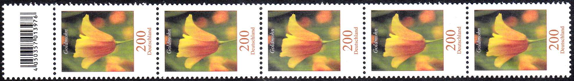 Auch bei den ab 2017 gefertigten Rollen der Marke zu 200 Cent (MiNr. 3116) mit dem Motiv Goldmohn (Eschscholzia californica) folgt nach jeder 5. Marke (mit Nummer) ein kleines Zwischenfeld mit EAN-Codierung.