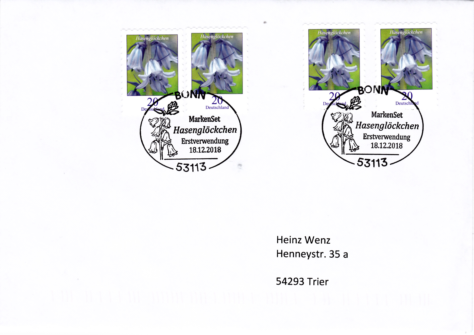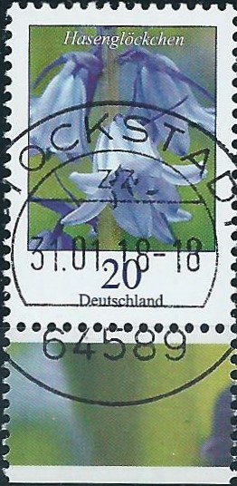 Gefolgt von dem 20 Cent-Wert Hasenglöckchen vom Unterrand mit Stempel Stockstadt vom 31.1.18: